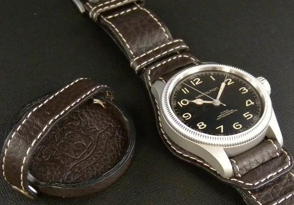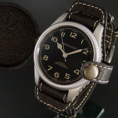 Дизайн с "монетными" ребрами и интересная форма стрелок навеяны часами из военных заказов 20х-30х гг. прошлого века, что для фирмы Hamilton, существующей с 1892 г. и с 20х гг. бывшей поставщиком армии США, вполне естественно. Из той поры родом и защитная крышка. Кстати, предусмотрена возможность снятия крышки, равно как и возможность замены всего ремешка.