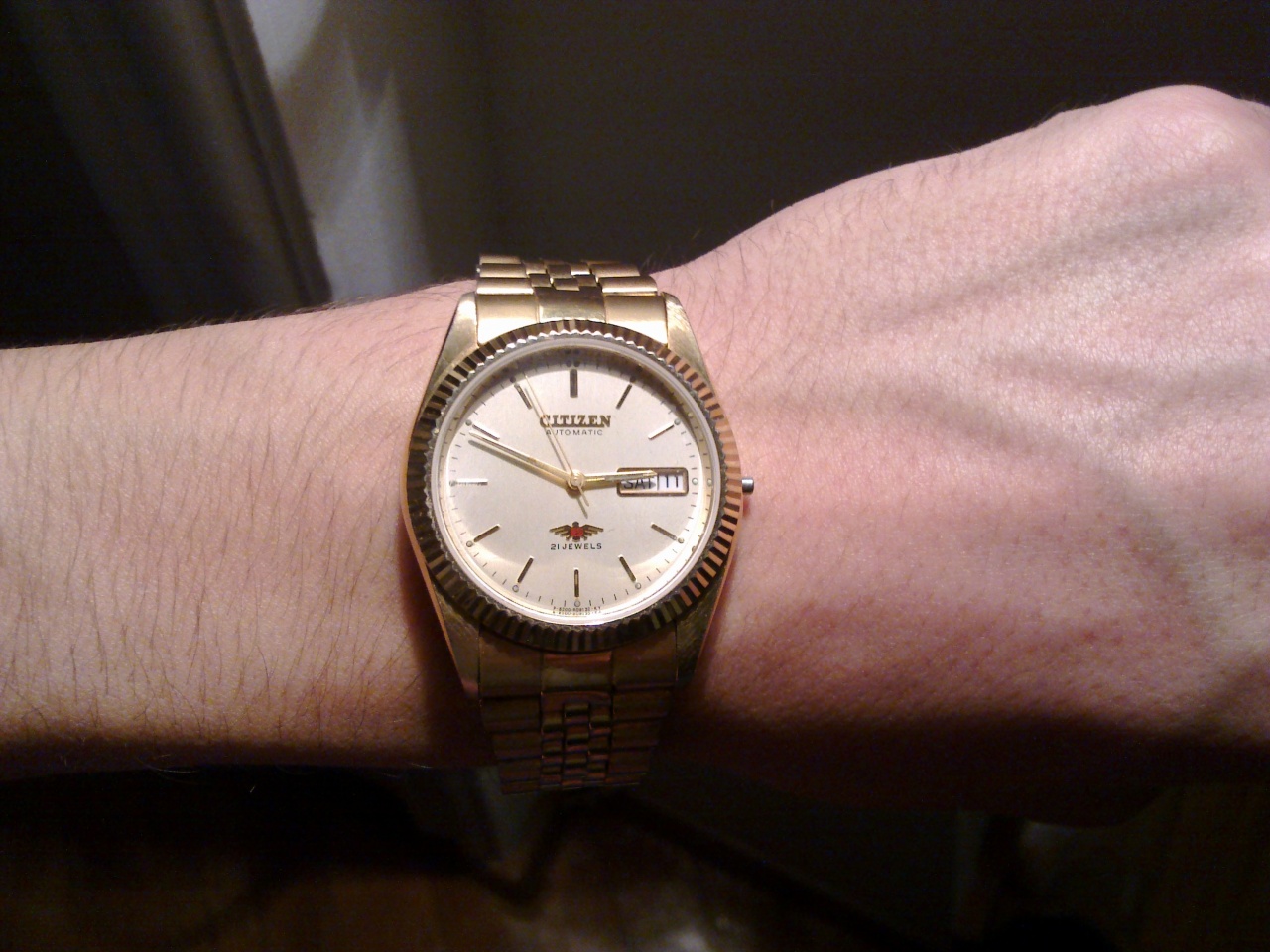 И тут вдруг меня осенило. Прежде чем купить кота в мешке, не лучше ли будет проверить все возможные варианты на местной интернет-барахолке. В основном в рубрике "Часы" попадались варианты типа "Rolex 55 евро срочно" или "Audemars Piguet 1000 леев" и т.д и т.п. И в самом конце списка, странице на 30, я нашёл именно то, что хотел себе купить, за ооочень приемлемую цену! Вот они, мои новые старые(но в обалденном состоянии) Citizen'ы! Есть небольшая поломка - коронка оторвалась от оси, но это чинибельно. Фото сделано камерой телефона за неимением фотоаппарата под рукой, а рядом фото именно того, чего так неистово желал