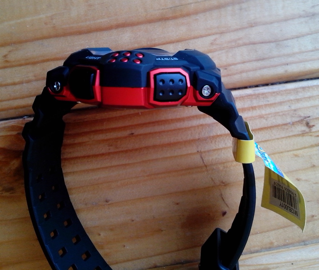 Когда я впервые увидел M128J001Y, то эта модель внешне мне напомнила CASIO GW200MS, хотя ближе всего она походит на CASIO GW-9010. Сами часы Q&Q M128J001Y крупнее GW200, но легче. Красный цвет на самом деле не простой, а красный металлик. Очень красиво смотриться. Ремешок имеет 2 рядя отверстий, мягче чем на простых CASIO G-Shock, которые у меня есть, и тем более чем на GW200MS, и к тому же буквально на 0.5-1мм шире чем у FROGMAN.