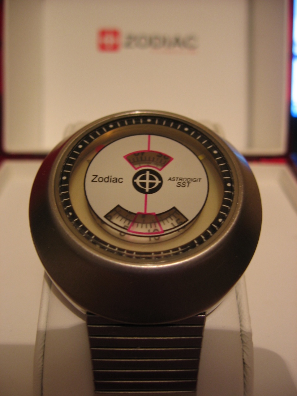 Приблизительная дата выпуска-начало 70-х, калибр Зодиак 88Д, аналогичный Астрографику. Используется система показа времени Jump Hour, верхнее окошко показывает часы, нижнее-минуты, красная плавающая точка-секунды. Помимо этого два диска с часовой и минутной стрелками. Оригинальная заводная головка и винтажный браслет из нержавейки (не Зодиак!). Корпус немного полировался, стекло абсолютно чистое.