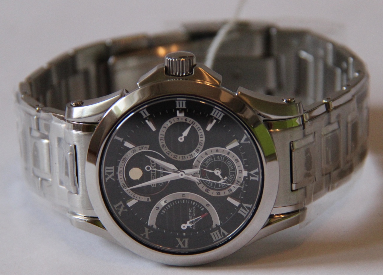 Автокварцевые часы системы SEIKO KINETIC Direct Drive. Калибр 5D88. • Возможность зарядки аккумулятора посредством вращения заводной головки. • Стрелочный индикатор работающий в 2 режимах: при активном использовании индикатор в режиме реального времени отображает уровень вырабатываемой энергии системы KINETIC для зарядки аккумулятора, в режиме покоя индикатор показывает уровень заряда аккумулятора. • Стрелочный индикатор даты. • Аппертура индикатора фазы Луны. • Стрелочные указатели дня недели и времени суток. • Продожительность работы после полной зарядки аккумулятора - более 30 дней. • Точность хода +/-15 сек в месяц. • Корпус из высококачественного стального сплава 316L с высокими антикоррозийными свойствами. • Сапфировое стекло устойчивое к царапанию. • Литой браслет из нержавеющей стали. • Водозащита до 10 АТМ.