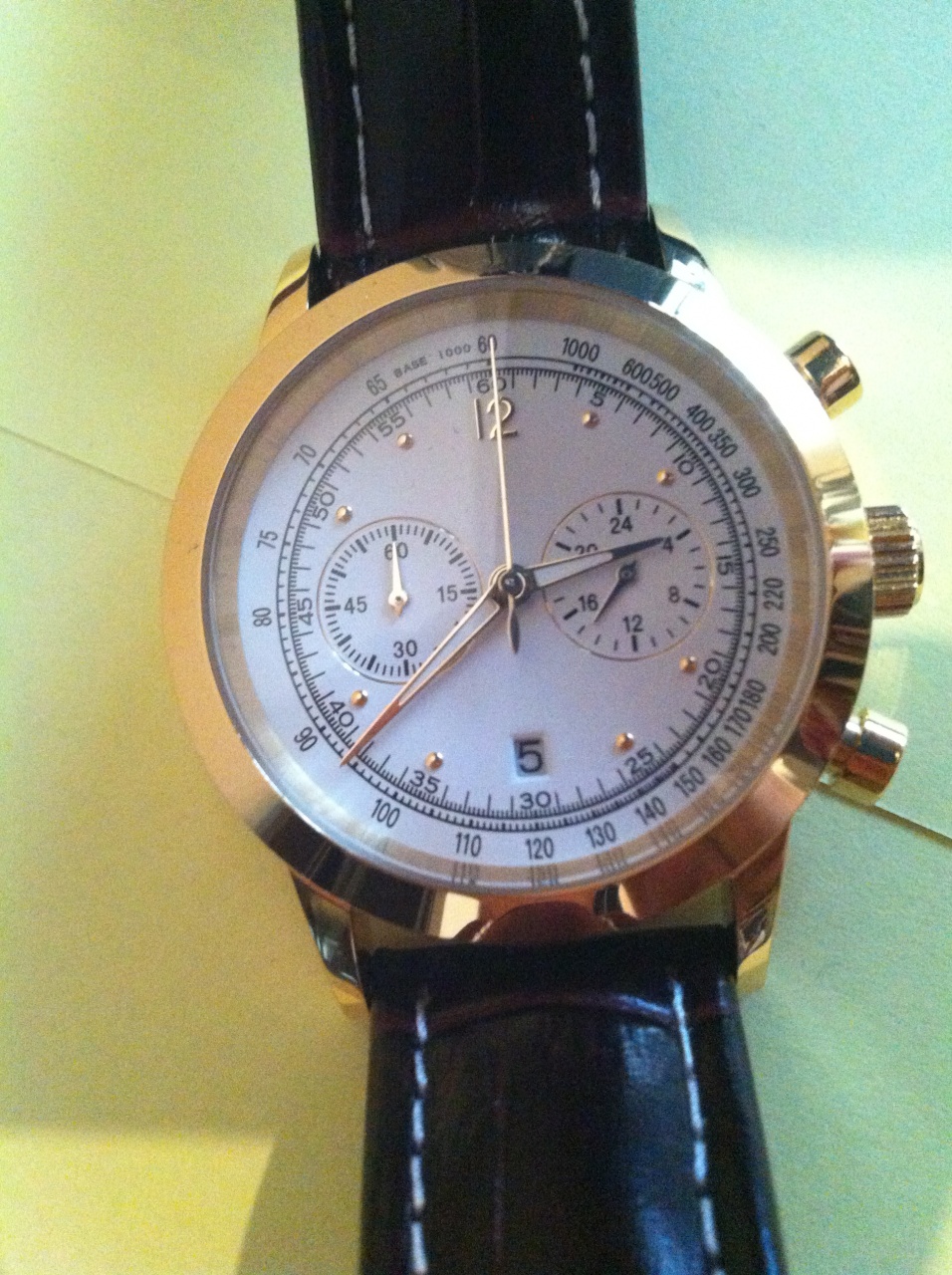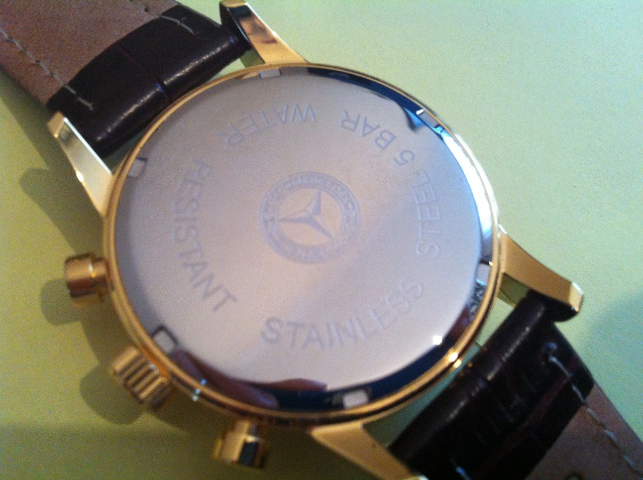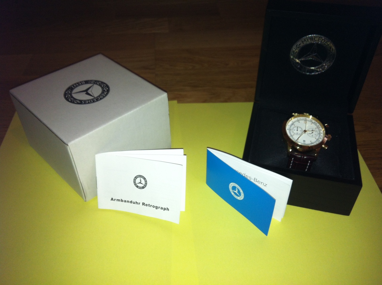 Часы - хронограф "Retrograph" с коричневым кожаным высокого качества ремешком с тиснением под крокодиловую кожу. Белый циферблат, корпус из позолоченной нержавеющей стали, индикация даты, функция секундомера на 60 минут, 24-часовой циферблат, кварцевый механизм калибра Мийота OS 21, водонепроницаемость до 5 АТМ, минеральное стекло. На заводной головке и на задней крышке часов выгравирована ретро-звезда "Мерседес-Бенц". Диаметр часов 43 мм без заводной головки. Новые. Стоимость 8 000 рублей.