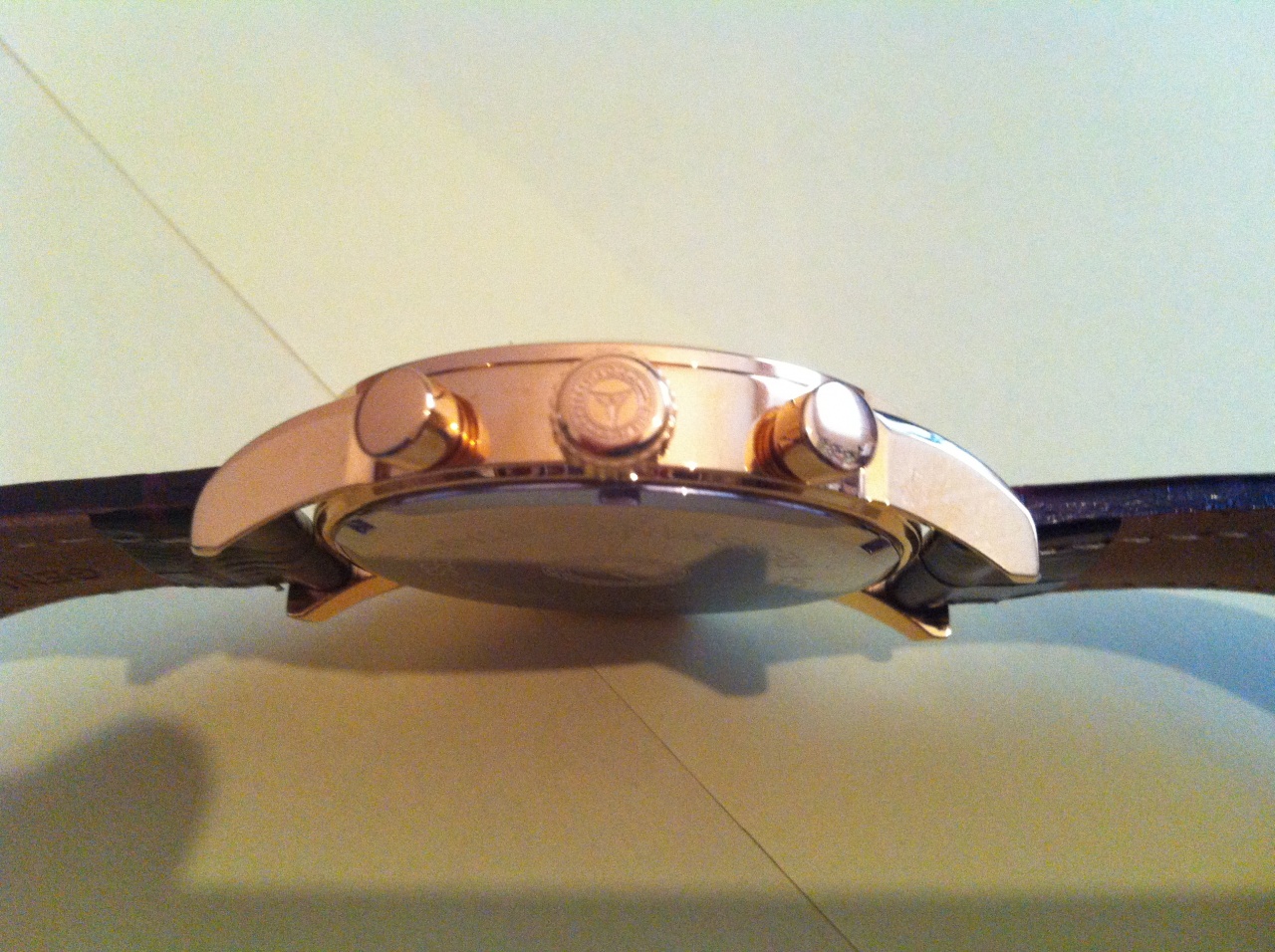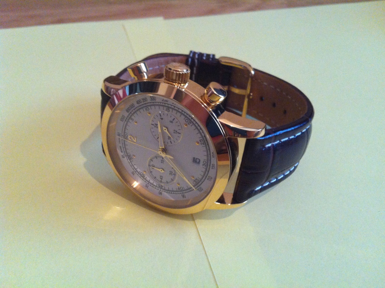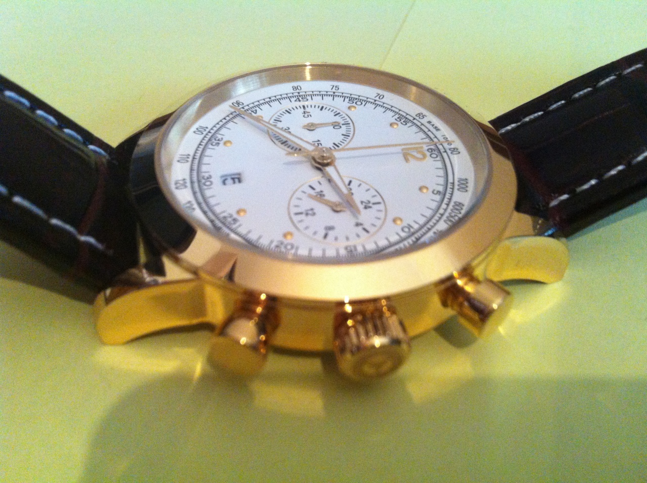 Часы - хронограф "Retrograph" с коричневым кожаным высокого качества ремешком с тиснением под крокодиловую кожу. Белый циферблат, корпус из позолоченной нержавеющей стали, индикация даты, функция секундомера на 60 минут, 24-часовой циферблат, кварцевый механизм калибра Мийота OS 21, водонепроницаемость до 5 АТМ, минеральное стекло. На заводной головке и на задней крышке часов выгравирована ретро-звезда "Мерседес-Бенц". Диаметр часов 43 мм без заводной головки. Новые. Стоимость 8 000 рублей.