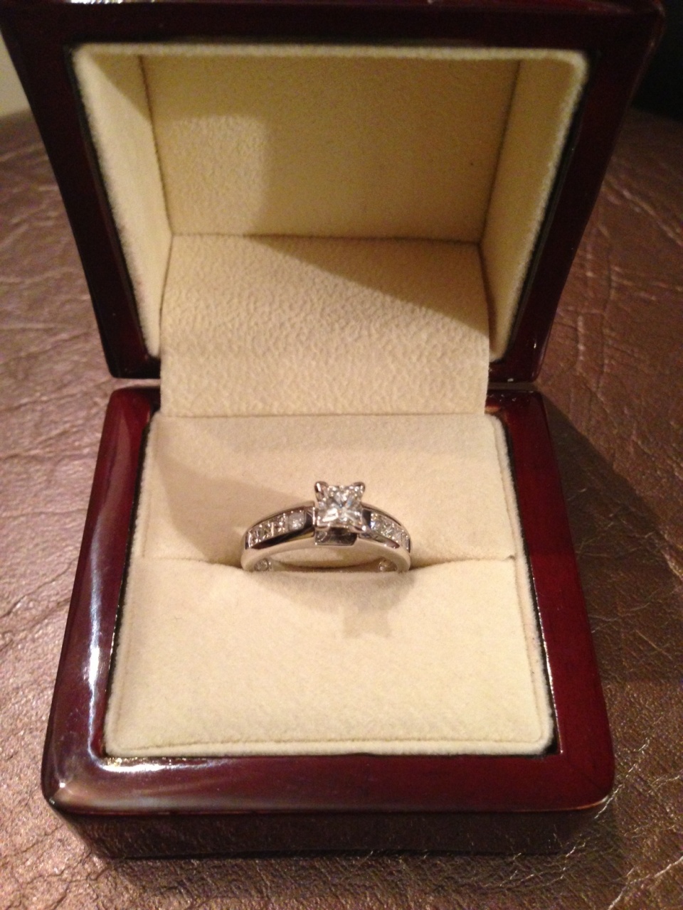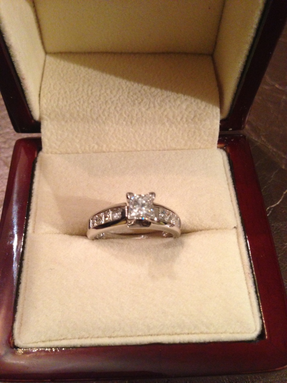 В продаже великолепное кольцо из белого золота 14К(585 проба) с центральным бриллиантом 0,54 карата и боковыми еще на 0,5. Общий вес 1,04 карат.
