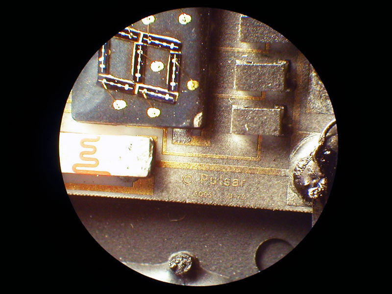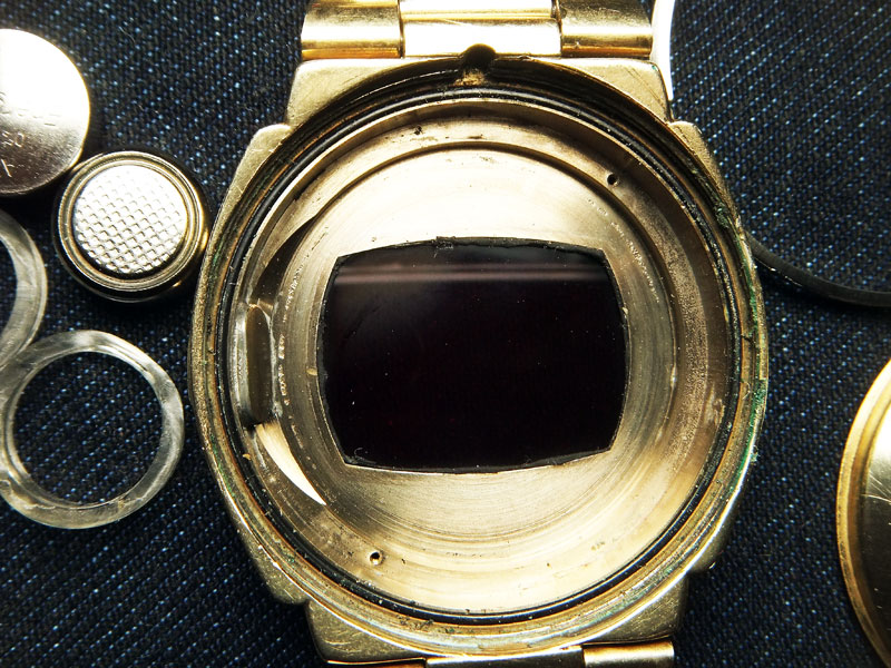 На модели Pulsar P2 "VIP" используется красное минеральное стекло, устойчивое к царапинам (но не более того). При хорошем свете через стекло видны элементы конструкции модуля: LED-дисплей, фотоэлемент (вертикально расположенный фотоэлемент говорит о том, что это поздний модуль, произведенный в конце 1972-го или даже в 1973 году), чип и синхронизатор слева от него (timing trimmer).