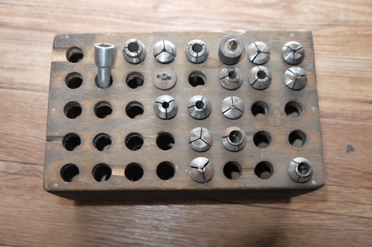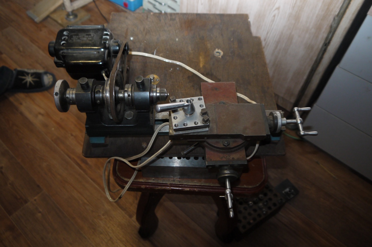 В комплекте сам станок, задняя бабка, подручник, суппорт для резцов, набор цанг и несколько резцов.