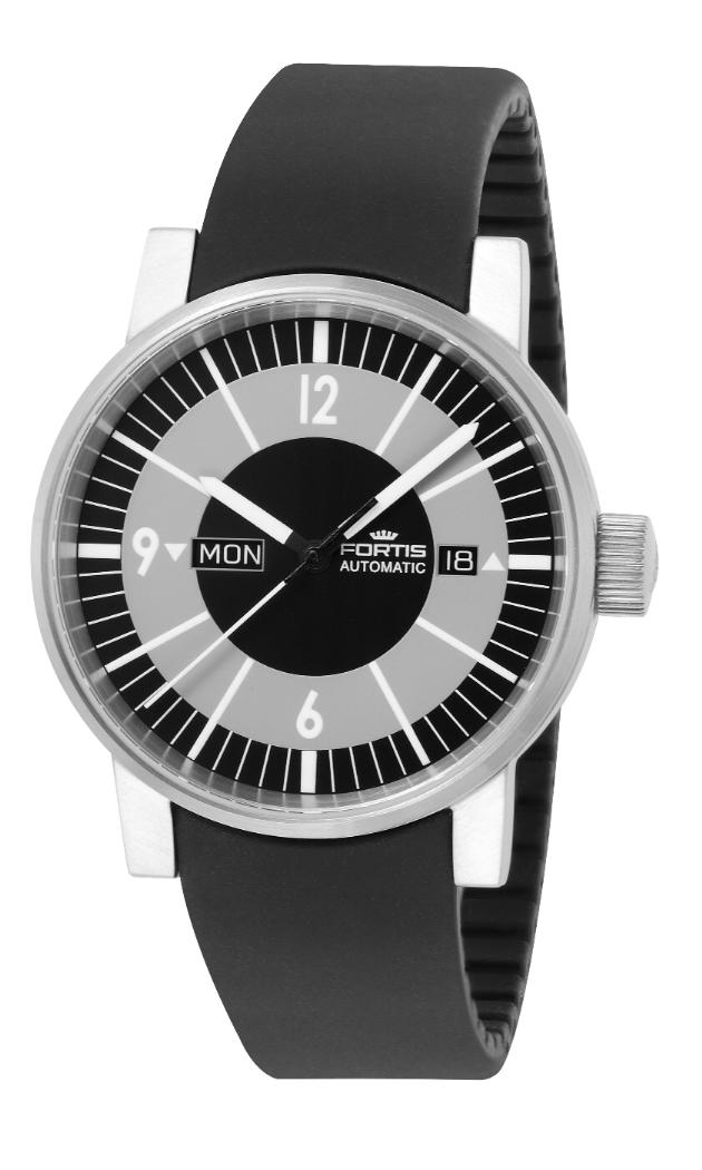 Новая модель Spacematic Bilingual от швейцарской часовой компании Fortis имеет круглый корпус изготовленный из нержавеющей стали, диаметром 40 мм, водонепроницаемый до 100 метров. На торце рифленой заводной головки, расположенной на 3 часах, выгравирован логотип бренда Fortis. Сапфировое стекло защищает циферблат белого или черного цвета с, соответствено, черной или белой часовой и минутной разметкой и арабскими цифрами. Стрелки ченгого или белого цвета, покрытые люминесцентным составом белого цвета.