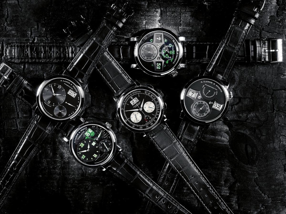 Сегодня мы берем крупным планом пять черных моделей A. Lange & Söhne (слева направо): Grand Lange 1, Grand Lange 1 «Lumen», Datograph up/down, Lange Zeitwerk «Luminous» и Lange Zeitwerk.