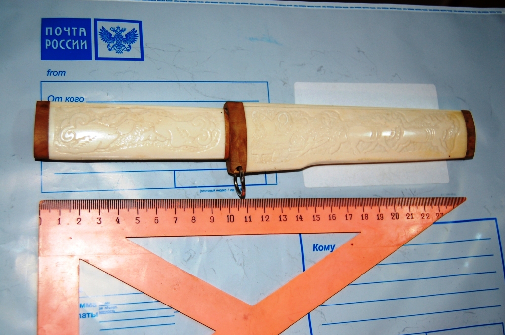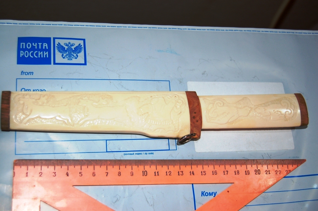 Ножны: длина 155 мм, ширина 40 мм, толщина 18 мм. Резьба по кости (Каюр с упряжкой).