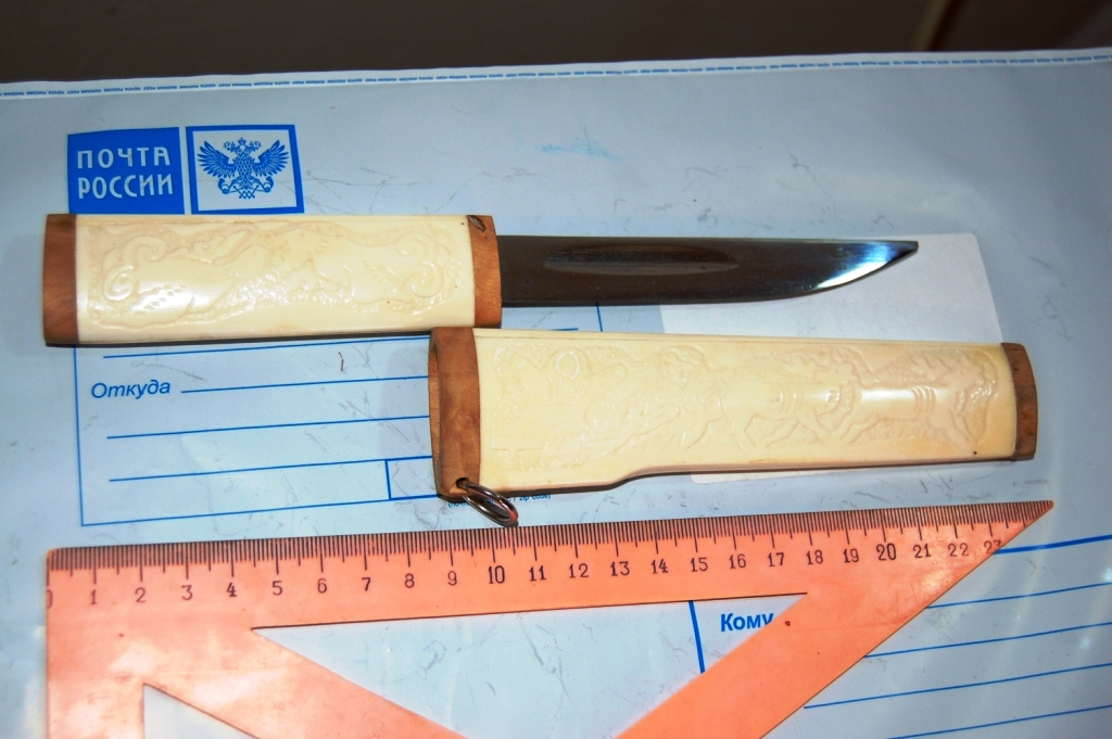Материал рукояти и ножен: Клык моржа, оконечники – карельская береза.