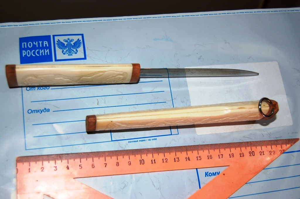 Декоративный нож с резными рукояткой и ножнами из клыка моржа