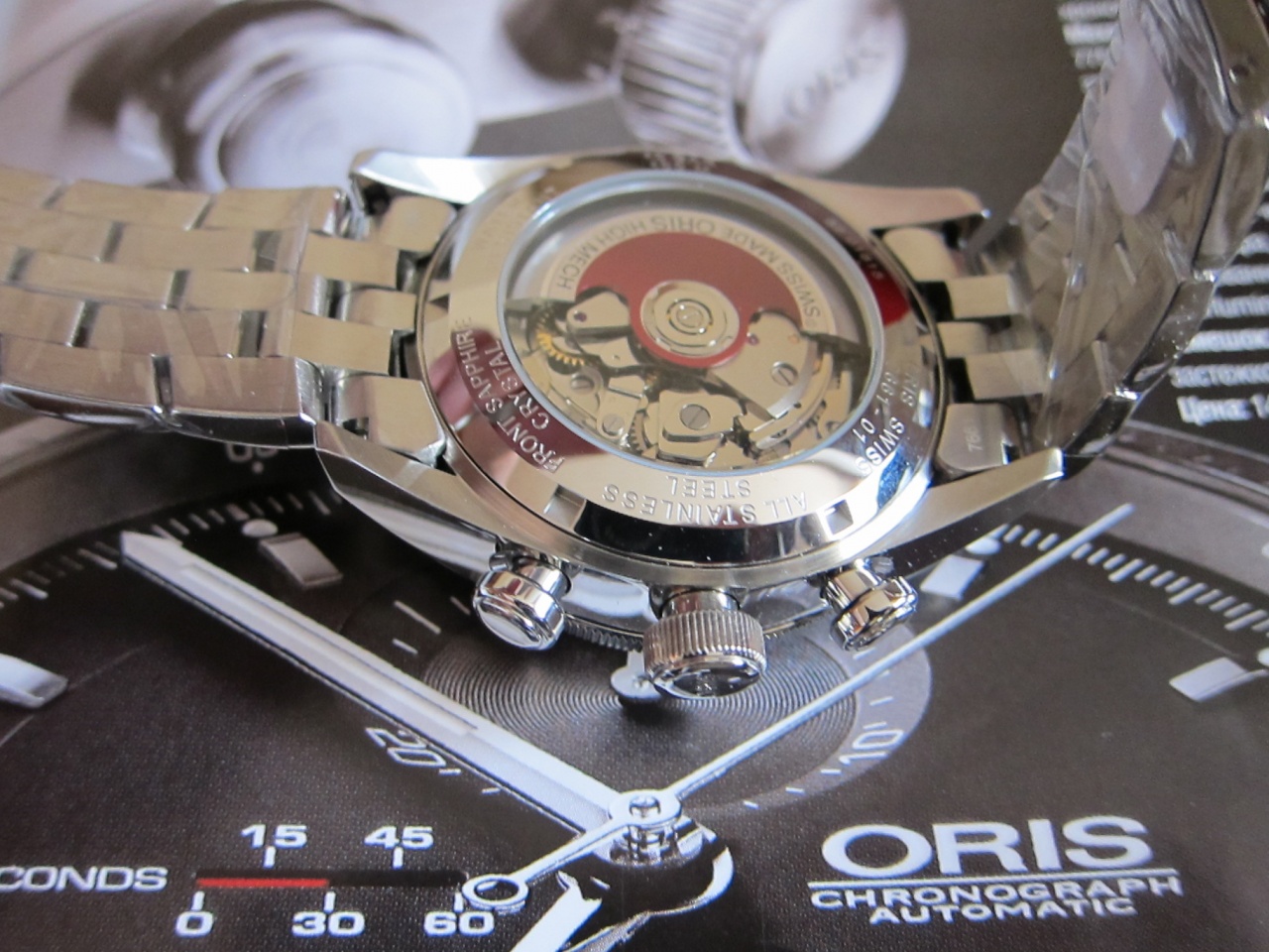 Сапфировое стекло и прозрачное окошко в задней крышке с винтовым соединением с корпусом. Водостойкость 100 метров. Автоподзавод с красным ротором.
