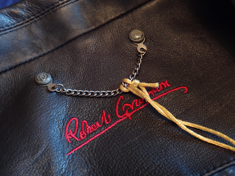 Отворот воротника - вышитый девиз Robert Graham "Knowledge. Wisdom. Truth." ("Знание. Мудрость. Истина")