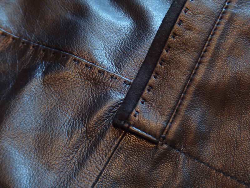 Швы крупной строчкой, отделка карманов и лацканов замшей: