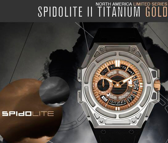 Новинка SpidoLite II Titanium Gold в отличие от двух ранее выпущенных вариантов часов Blue и Red обладает другой цветовой гаммой циферблата. Новинка, как и предыдущие модели, обладает скелетонизированным корпусом, целиком выполненным из титана. Заводная коронка изготовлена из 18-каратного розового золота.