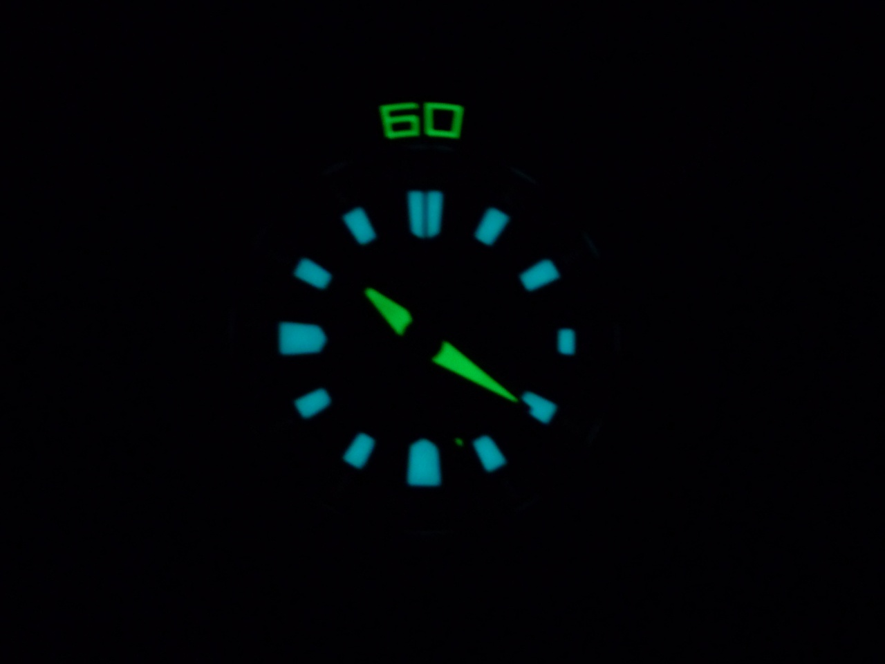 Часы выглядят очень классно, читабельность отличная. Циферблат просто изумительный, красиво переливается мелкими, но четкими, качественно проделанными гранями….мне даже напомнило турбину с очень маленькими лопастями. Минеральное стекло с антибликом имеет хорошую прозрачность, с едва уловимой синевой. Корпус стальной с черным ионным покрытием придает дороговизны, так как очень похож на керамику. Базель на 120 кликов приятно потрескивает при прокрутке. Каучуковый ремешок приятный на ощупь, хорошо сидит, а оранжевый цвет вносит нотку веселого, яркого настроения. Хотя по длине ремешок мне великоват, хотелось бы чу-чуть короче. Думаю обрезать немного, но пока не решился на такой шаг. Люм хороший, стрелки и цифра 60 на базеле светят зеленым, а метки голубым. Насчет длительности люма я не проверял, но если немного поносить даже в комнате, а потом зайти в темное место, часы излучают яркие, сочные, синие и голубые цвета. Насчет размеров могу сказать одно, часы на большой и на маленькой руке будут смотреться отлично и совсем не будут казаться большими, неуклюжими и т.д. По весу меня вполне устроило 130 грамм на руке и при носке нет дискомфорта.