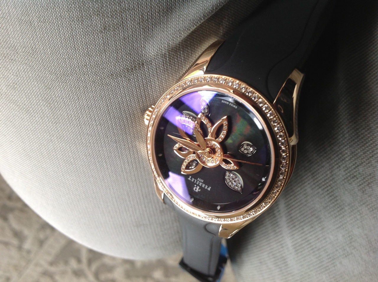 2 Сегодня же Perrelet создал то, что можно по праву назвать новой категорией дамских часов, сочетающей в себе два ранее отличных друг от друга мира – мир драгоценностей и мир часовой механики. В основе мира ювелирных изделий всегда лежала чисто эстетическая подоплека. Снабдив же драгоценности дополнительной функцией, Perrelet превратил их фактически в элемент механики. И на то, чтобы попасть в разряд этой новой категории первой, претендует именно коллекция Perrelet Diamond Flower. Помещенный на циферблат предмет ювелирного искусства Diamond Flower является не только приманкой для глаз, но и роторным элементом, повторяющим движения владельцы часов и питая необходимой энергией механизм автозавода. Этот прекрасный союз стал возможен исключительно благодаря использованию эксклюзивного калибра Perrelet с двойным ротором (Double Rotor). Оба безупречно синхронизированных ротора (с тыльной стороны и со стороны циферблата) обеспечивают достаточным питанием, аккумулируемым от движений владельца часов, ходовую пружину часового механизма. Тем самым, хронометр перманентно обеспечен надежным источником питания. Следует отметить еще один интересный аспект, касающийся новой коллекции Perrelet Diamond Flower. Несмотря на то, что дизайн большинства дамских часов разрабатывался дизайнерами-мужчинами, Perrelet сделал свой выбор в пользу дизайнера женского пола. Перед Кармен Фёгели, одной из молодых дизайнеров Perrelet, была поставлена задача сформировать эстетику Diamond Flower. Для работы над проектом она практически на несколько месяцев заперлась у себя в комнате. Произведение ее рук стало воистину сочетанием многих часов работы и интуитивного, женского подхода к созданию дизайна, предназначенного конкретно для женщин. И пусть этот факт далеко не первый, он, по-прежнему, остается относительно редким явлением в мире часового дизайна. В конце концов, кто, как не талантливая женщина-дизайнер, способна удовлетворить запросы и пожелания современных женщин? Корпус этих удивительных часов выполнен из розового золота и инкрустирован 162 бриллиантами (1.181 ct). Циферблат черный. Запас хода 40 часов.