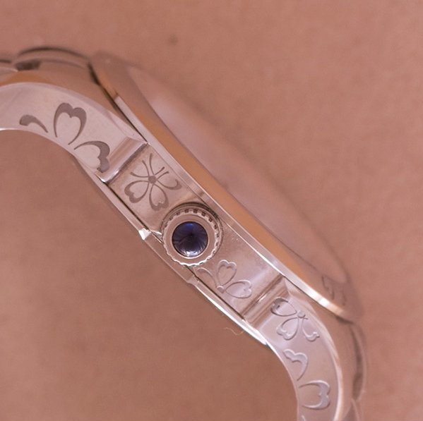 Циферблат - натуральный перламутр с рисунком цветков сакуры, такой же рисунок выгравирован по корпусу часов.