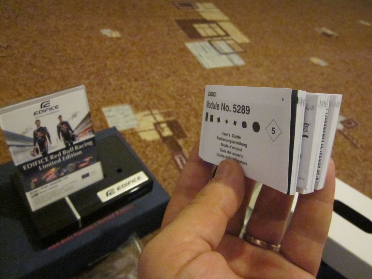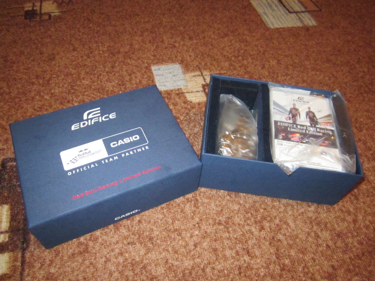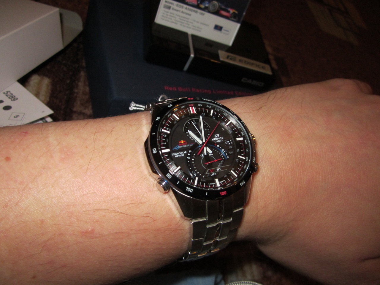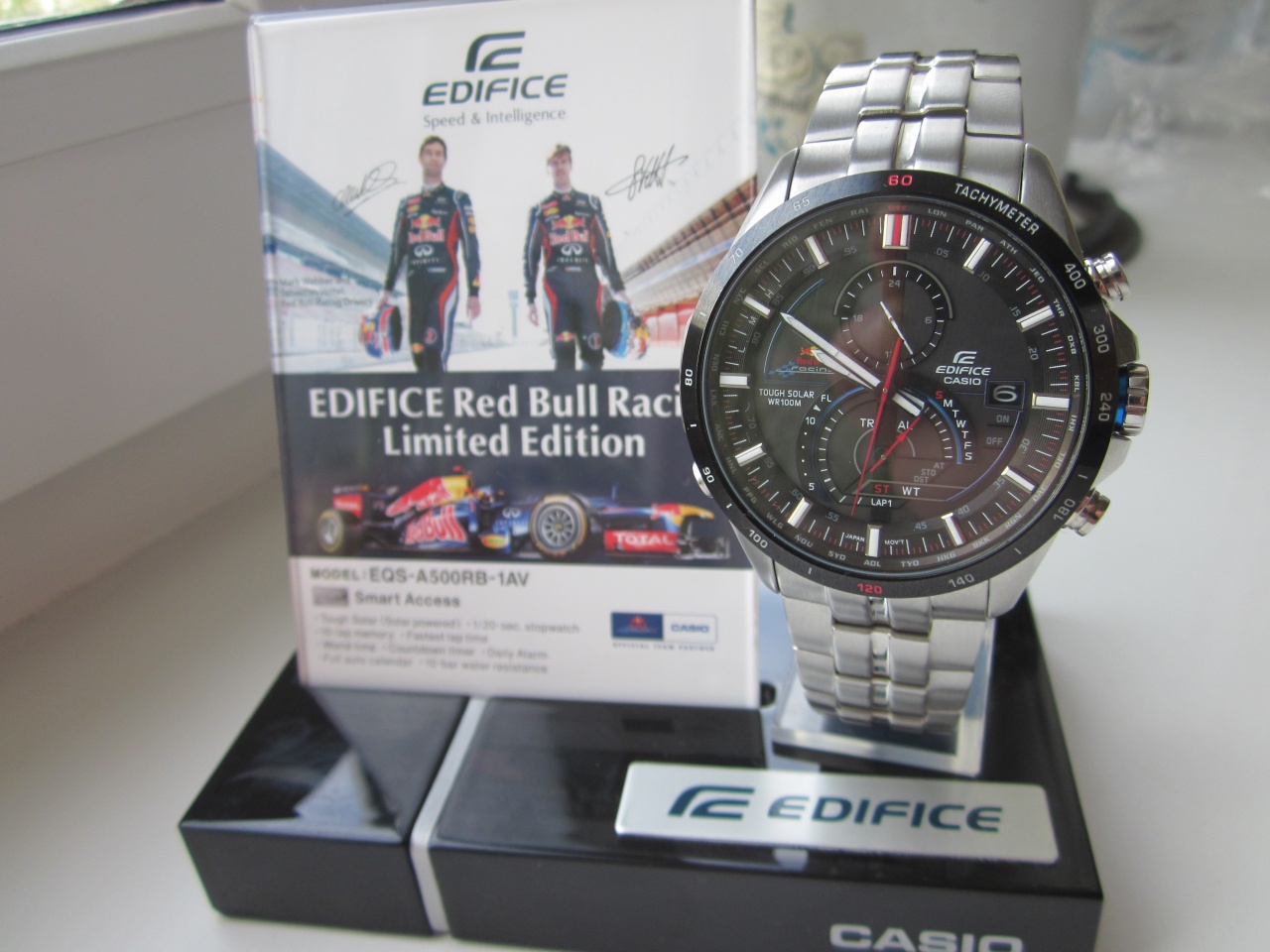 Долгое время был обладателем 131 Едифисов. захотелось чего то нового. Просматривал на Яндекс Маркете каталог Едифисов (в других себя уже не вижу). увидел EQS- A500RB и влюбился. В нашем городе таких не продают, заказал в одном из интернет-магазинов (кстати, рекомендованных этим форумом, как порядочных). Ждал две недели и вот оно! В комплекте паспорт на всех языках, кроме русского (впрочем, продавец послал распечатку русского перевода), чек о продаже от продавца, внушительная коробка и непонятные пластмассовые детали, которые позже оказались подставкой под часы. Такие подставки я видел на рекламных фотографиях и вовсе не ожидал, что ими комплектуется каждая единица часов. Как и ожидал, вживую эти часы смотрятся в полтора раза лучше. чем на самых удачных фото в сети (а я их пересмотрел массу, коротая ожидание заветной посылки). Возникли некоторые проблемы с идентификацией часового пояса, в сети подсказок не нашел, в инструкции непонятно, продавец тоже не смог объяснить, но через пару часов додумался: коды часовых зон идут по ободку часов, они теряются на фоне массы деталей и на первый взгляд не видны. Смарт эксесс, конечно, впечатляет: пять независимых моторов, они просто завораживают, когда стрелки перестраиваются из режима в режим против часовой стрелки и с разной скоростью)) Браслет оказался менее массивным, чем на 131, и уже цапнул у меня с руки волосок, этого от часов в 3 раза дороже я не ожидал. Стоит сказать и о том, что именно модель "Ред булл" я предпочел такой же, но без символики формульной команды только из-за того, что синий цвет очень удачно ложится в дизайн часов, поэтому я счел возможным переплатить пару тысяч. Легкое разочарование: вживую синий цвет намного менее яркий, чем на фотографиях в сети, и почти сливается с черным циферблатом. Больше недостатков я пока не нашел. И к вопросу о подделках: никакой уверенности в том, что у меня оригинальные часы нет и не надо. Если китайцы в состоянии оснастить часы таким интеллектом, солнечной батарейкой и пятью моторами, честь им и хвала - буду носить эти часы с еще большей гордостью))) Это мой первый пост на форуме, прошу не пинать)