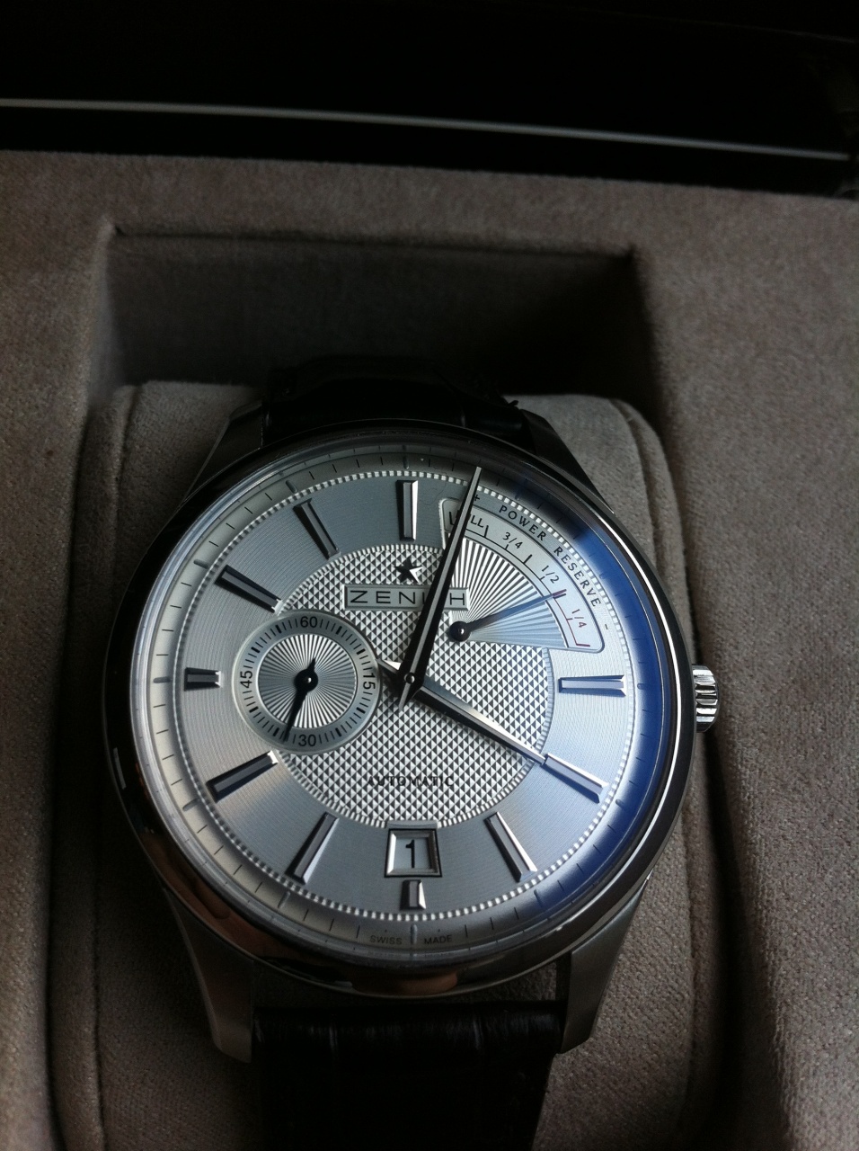 Автоматический механизм Elite 685 (частота 28,800 пк/час (4 Гц), 179 деталей, 38 камней, ротор с отделкой «Côtes de Genève»).