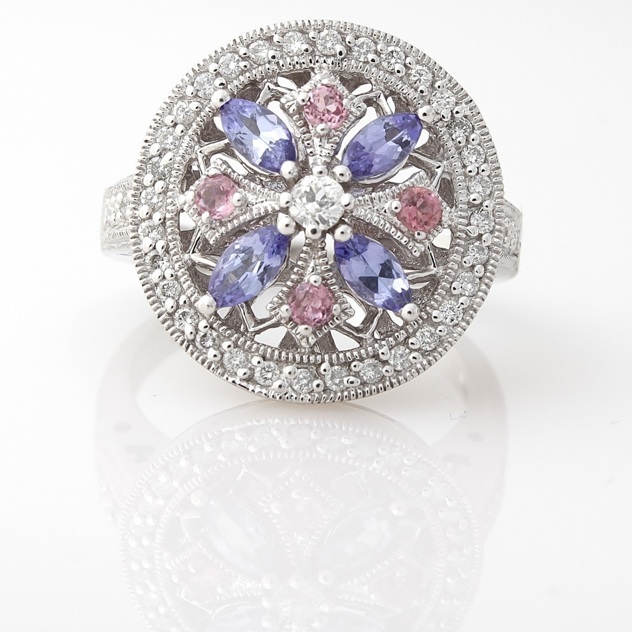В продаже великолепное кольцо EFFY из белого золота с бриллиантами, сапфирами и танзанитами общим весом 1,68 карат.