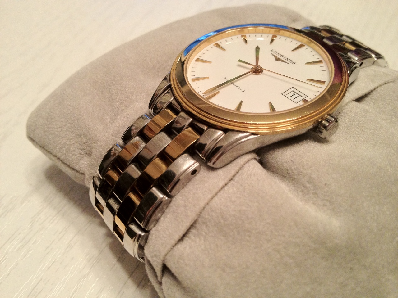 Longines Flagship. Механизм - автоматический. Диаметр корпуса - 36 мм. Индикатор даты. Прозрачная задняя крышка. Водостойкость 3 atm. Материал корпуса и браслета - сталь с PVD. Полный комплект с коробкой, документами и дополнительными звеньями браслета. На корпусе имеются незначительные потертости и царапины (см. фото). Во время обслуживания в 2009 г.была заменена спираль балансового колеса (сервис Eurotime).