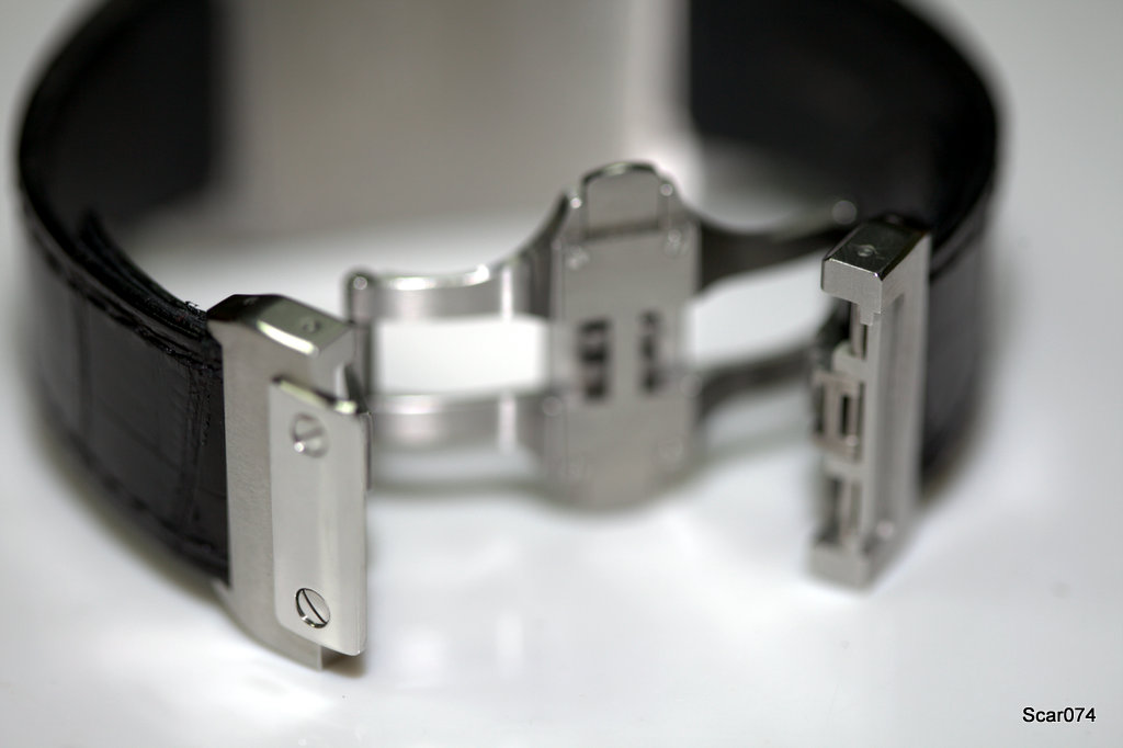 Ремень из кожи аллигатора, хорошего качества. Пока новый – твердый, уверен со временем станет мягче, но даже сейчас удобно облегает руку. Застежка раскладная в две стороны, стальная, с полированным стальным звеном посредине, также закрепленным двумя крупными винтами.
