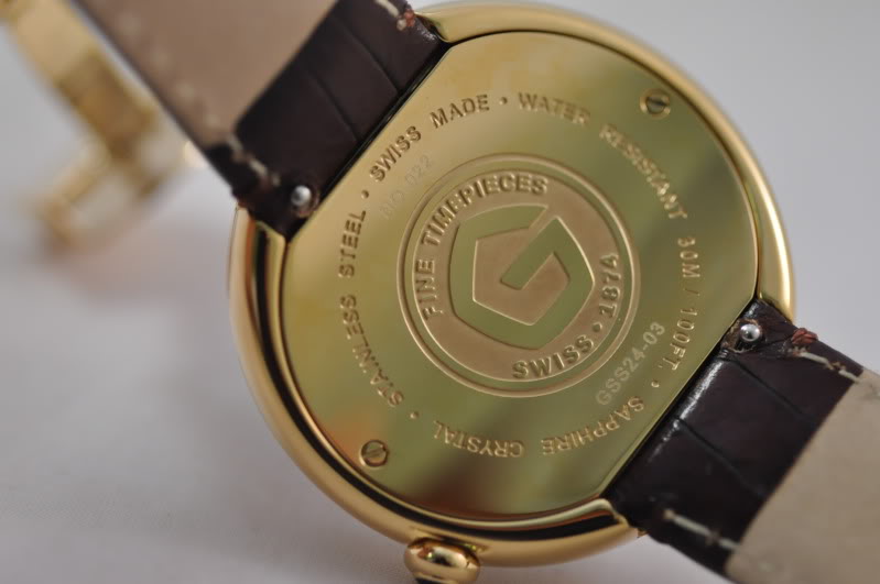 Фирменная "корона G" и клеймо Swiss присутствуют на циферблате.