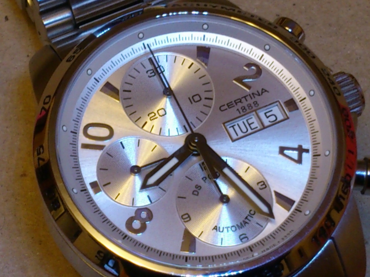 Сертина ДС Родиум Автоматик - аккуратный хронограф, вот фото моих часов (заказывал и получал сам ЗА ГРАНИЦЕЙ, для 100% гарантии подлинности), считаю что с браслетом светлый циферблат смотрится лучше, как единое целое.