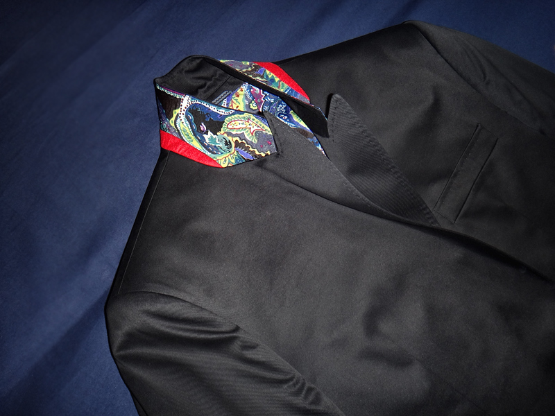 Отворот лацканов и воротника - цветная подкладка, сзади контрастная красная подложка и вышитый девиз Robert Graham "Knowledge. Wisdom. Truth." ("Знание. Мудрость. Истина"):