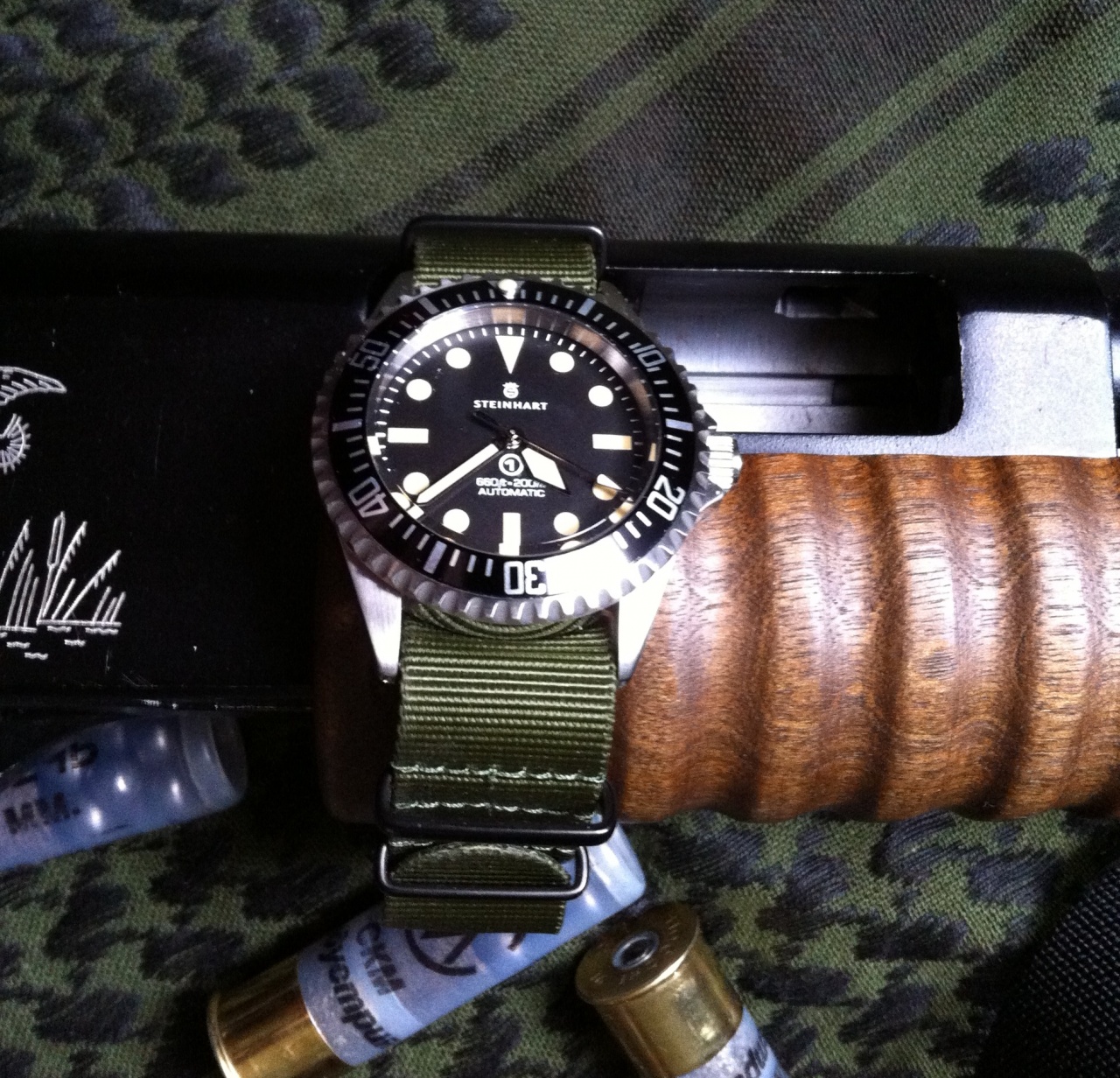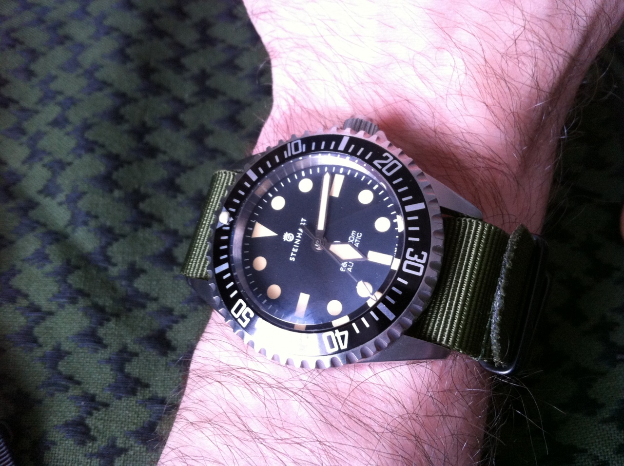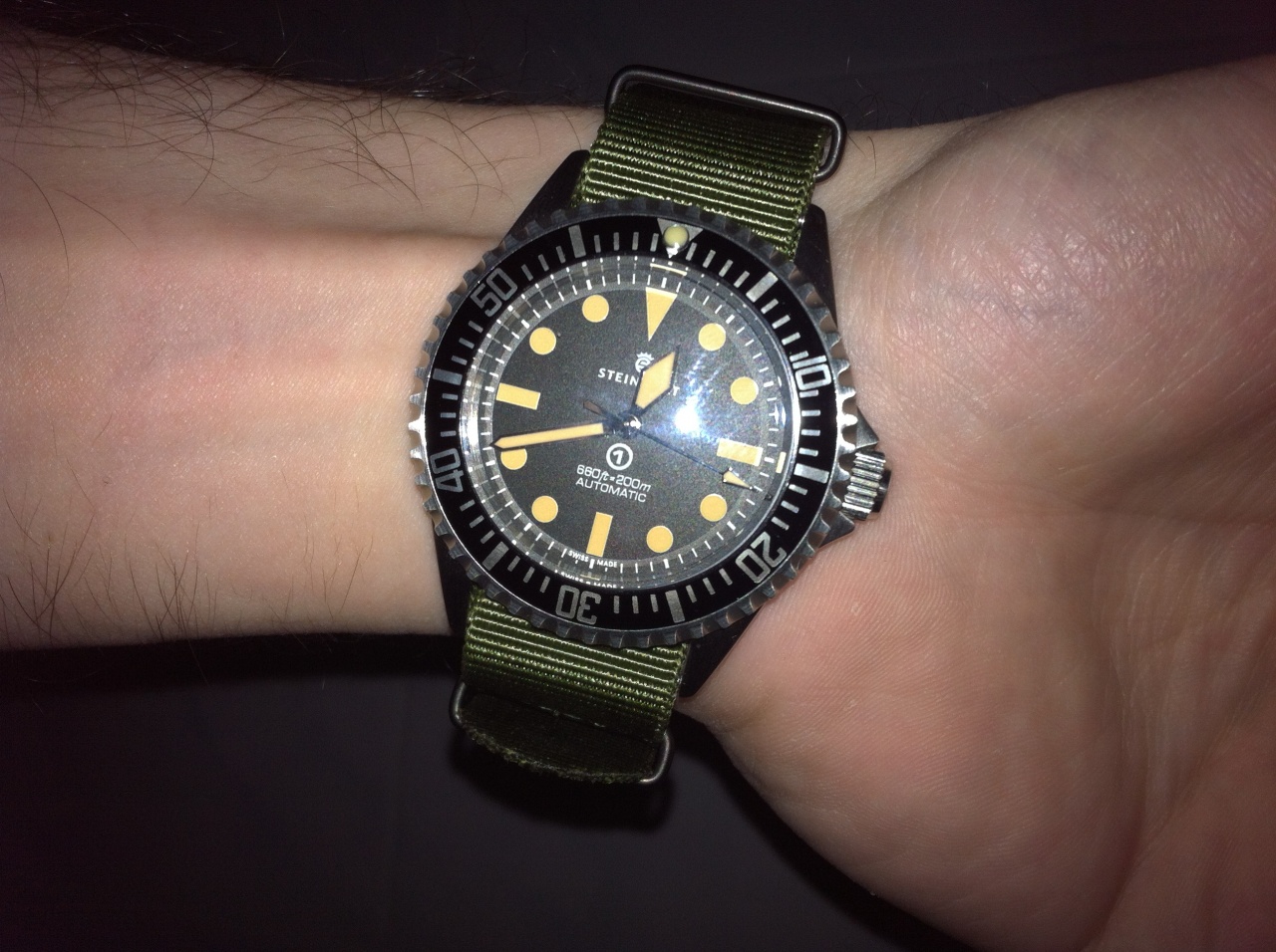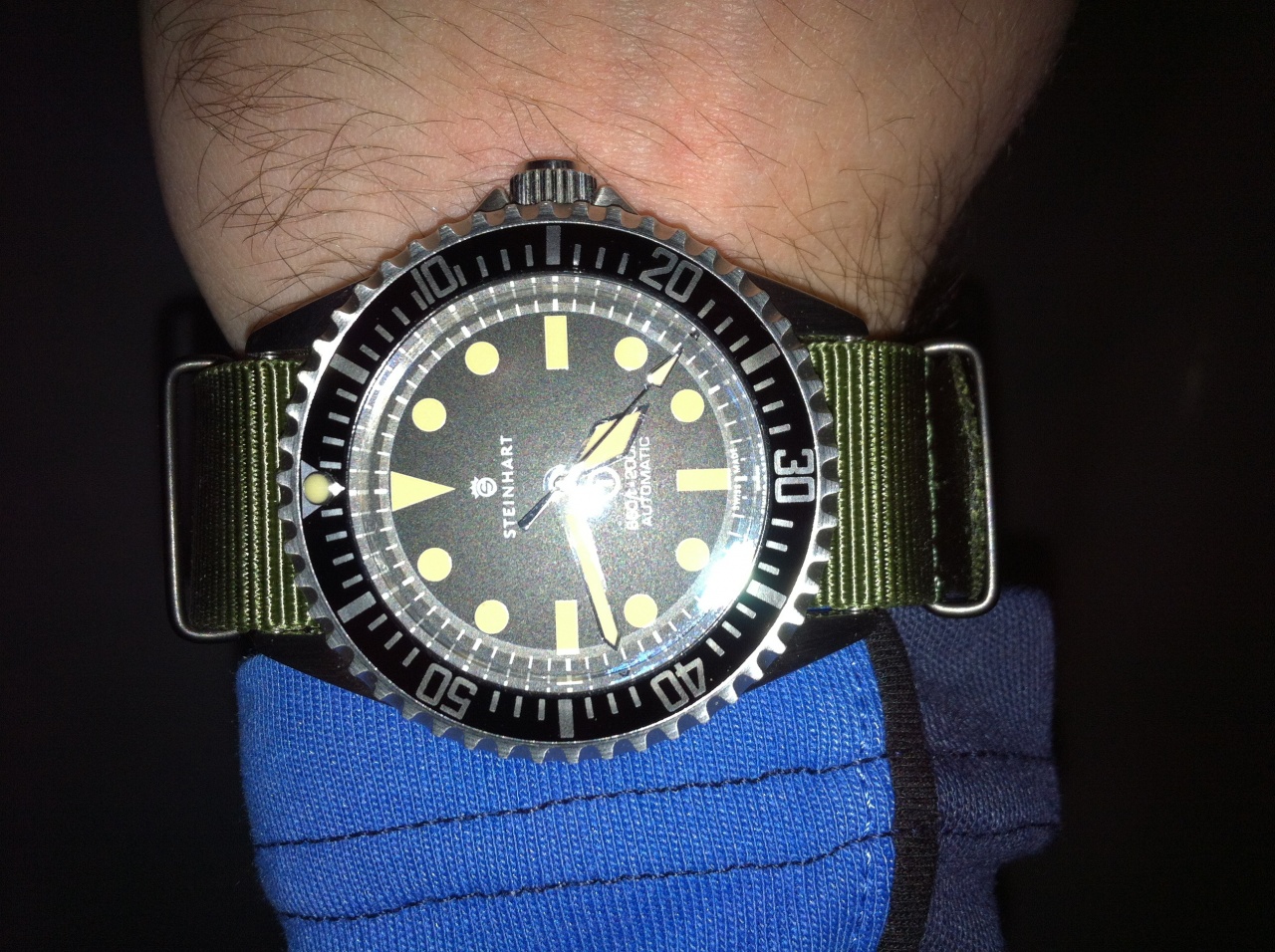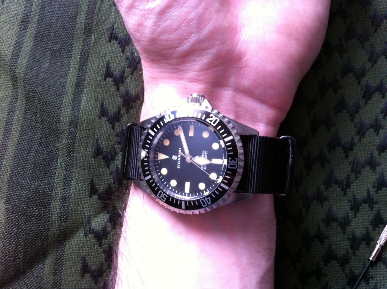 Браслет отрегулировал махом. Специально купленный для такого дела набор отвёрток Latherman Wave пришёлся кстати. Три звена минус и все хорошо. Но пока я крутил-вертел-подкручивал… взгляд то мой не отрывался от ремешка. "Armband Havanna Old Vintage"на этих часах это то, что нужно и больше ничего не нужно. Ещё конечно не помешает кожаный НАТО в том же колере, но это немного другая история. Чёрный ремешок с чёрной же строчкой – что он есть, что его нет. Обычный. Будь корпус часов чёрным DLC, там думаю было бы неплохо, а так – ремешок и ремешок. Эмоций не вызывает.