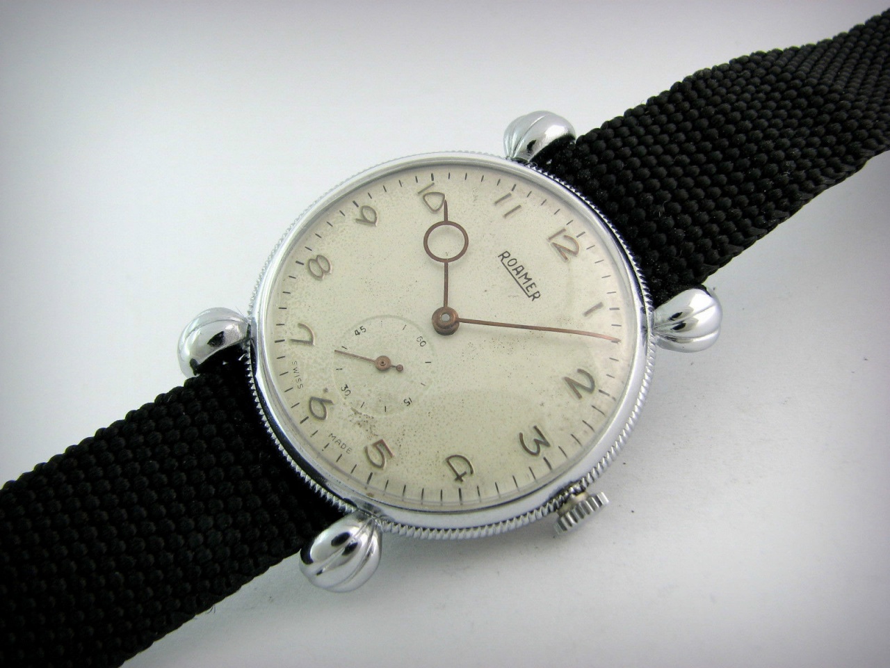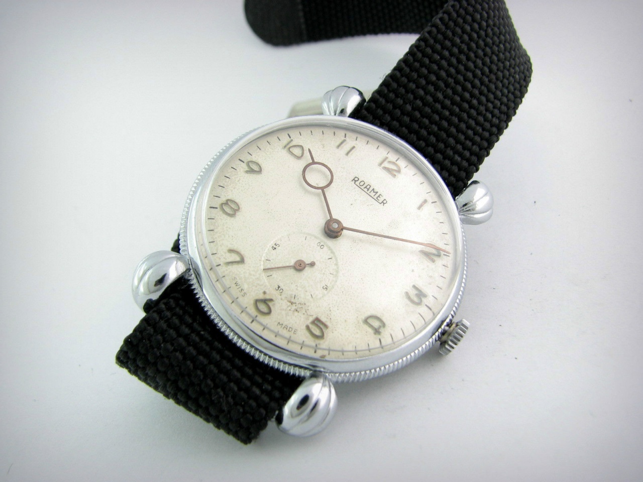Vintaga Бродяга начала 40-х Roamer Циферблат: оригинальный циферблат в подлинное состояние. Подписано: Roamer, швейцарские. Стрелки: оригинальный, в хорошем состоянии. Малая секундная. Механизм: Оригинальный,чисто и гладко работает MST cal.364 удивительно хорошо, на 15 камнях Показывает отличный хронометраж. Маховик работает сильно и мягко. Механический, чёткий, ручной завод: оригинальные детали. Корпус в отличном состоянии, профессионально восстановлен rechromed. Корона: новая в отличном состоянии. Стекло: новое в отличном состоянии. Размер корпуса: 36 мм с без короны, 43 мм выступ петель, петли на 18 мм ремень, неподвижные. Великолепные коллекционные Roamer с отличным механизмом, показывающим точный ход. Это часы были профессиоально обслужены в Германии. Замечательное достойное пополнение раритетной коллекции, откуда эти часы и появились в продаже. Невероятная редкость по общему состоянию при таком солидном возрасте и практически не попадает на свободные торги. Это для настоящего знатока.