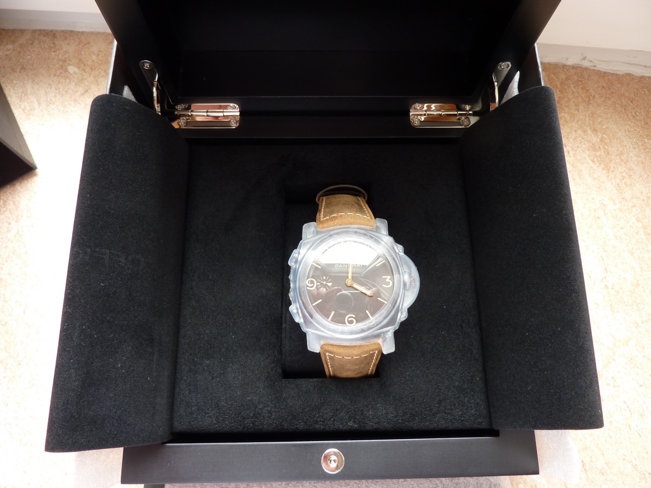 Ремешок Фирменный кожаный ремешок PANERAI с крупной пряжкой из коричневого композита Panerai. Задняя крышка Прозрачное тонированное сапфировое стекло.