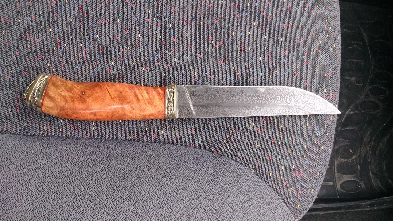 Продам нож из личной коллекции, клинок Тихомирова многослойный дамасск 115/30/4 общая длинна 290, рукоять AMBOYNA , больстер и навершие из латуни.Ножны кожа КРС подвес свободный.Нож заточен. Автор работы известный в ножевом мире мастер из Москвы "ED3". Пересыл в любую точку РФ ,наложенный платеж. цена 15тр.