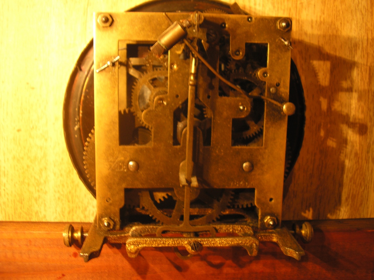 Несколько раз снимал заклинивший механизм ничего толком не понял, разобрался только в том, что часы клинят из-за боя, при раскрученной пружине ударного механизма (бой отключен) стрелка не встаёт колом, цепляется штифт шестерёнки торможения гонгом за вилку, которая связана с отсчётным колесом молоточка ударного механизма.
