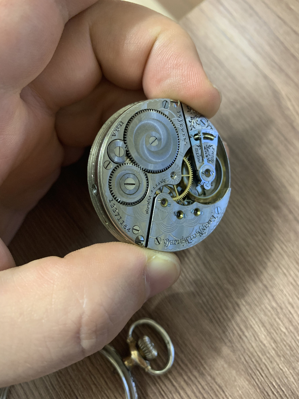 Карманные часы Elgin, 1906 год. Планировал сделать репассаж у профессионалов и самому переставить в корпус для наручных. Для замера механизма и корпуса стал разбирать, оказалось, что заводной вал к механизму не крепится, а вставляется в квадратный паз. Заводной вал при этом фиксируется в корпусе.