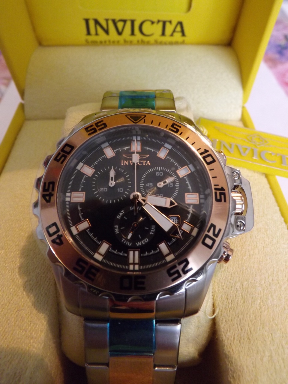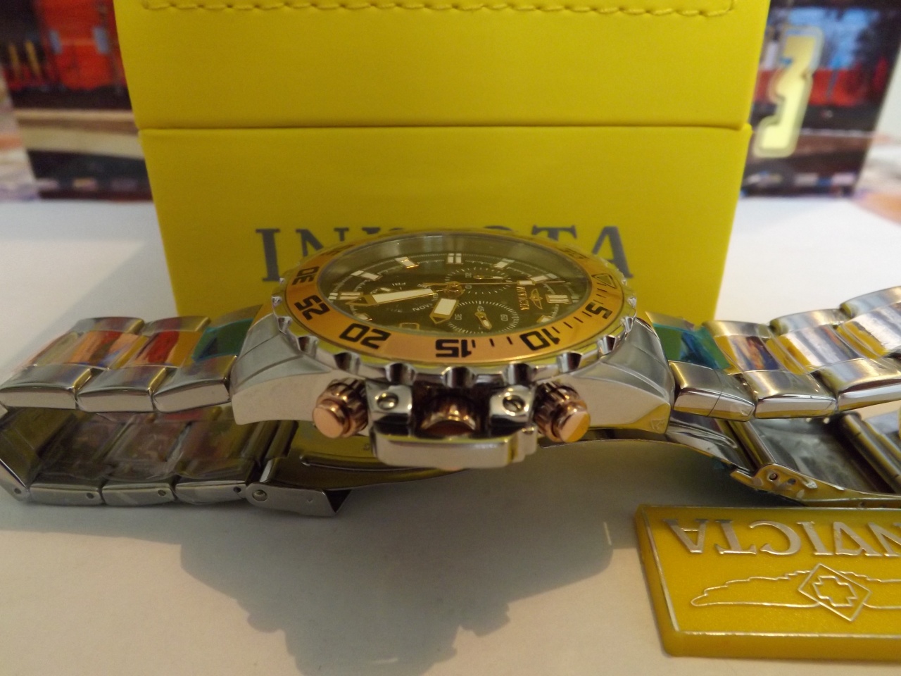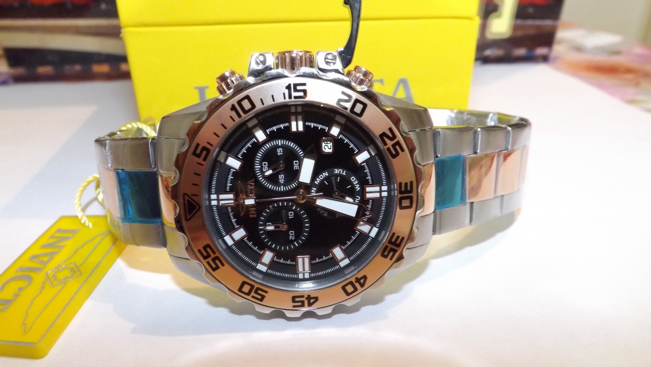 Мужские наручные часы Invicta Pro Diver Chronograph13628. 100% оригинал. Новые в пленках. Кварцевый швейцарский механизм ISA калибр 8172/220 с точностью хода +/- 20 сек/мес. Индикация даты, часа, минут, секунд, хронограф(секундомер). Циферблат черного цвета с текстурой. Стальные стрелки и крупные объемные индексы покрыты светонакопительным составом. Корпус выполнен из высококачественной нержавеющей стали и частичным золотым IPG покрытием. Однонаправленный безель. Стальной браслет с двойной застежкой маркированной логотипом INVICTA. Минеральное стекло изготовленное по фирменной запатентованной технологией Flame-Fusion обеспечивающей превосходную устойчивость к возникновению царапин. Раскладывающаяся застежка с фиксатором. Диаметр корпуса 44 мм. Толщина корпуса 14 мм. Водонепроницаемость 10 Атм (100м). Оригинальная коробка. Международная гарантия компании производителя. Инструкция по эксплуатации.