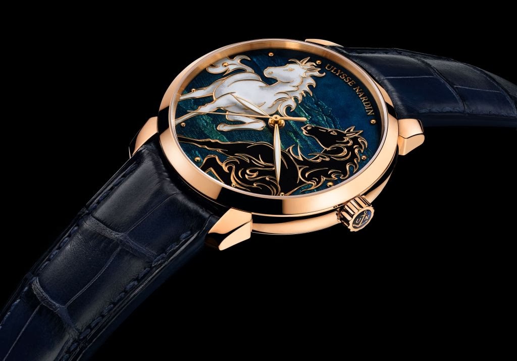 В честь наступающего в конце текущего месяца года Лошади (по китайскому календарю), швейцарская часовая компания Ulysse Nardin выпустила специальную лимитированную модель Classico Horse (Ref. 8156-111-CHEV_V5). Новинка отличается великолепным синим циферблатом, с изображением двух скакунов, выполненным в технике выемчатого эмалирования champlevé. При этом на поверхности циферблата специальным инструментом вырезаются углубления различной формы, размера и глубины, после чего они заполняются эмалью различных оттенков. В последующем циферблат помещается в специальную печь, где он подвергается обжигу, в процессе оторого эмаль плавится до получения нужной плотности. Далее поверхность полируется и проходит окончательный этап отделки. Выпуск эмалевых циферблатов часов Ulysse Nardin продолжается уже более 25 лет, благодаря сотрудничеству с фабрикой Donzé Cadrans, мастера которой специализируются на технологиях эмалирования. А с 2011 году указанная фабрика вошла в состав группы компаний Ulysse Nardin, что сделало последнюю одним из лидеров мирового часпрома по созданию расписных эмалевых циферблатов.