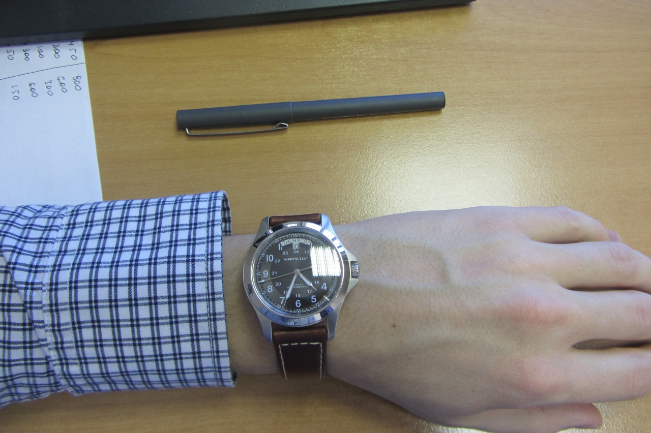 ) Hamilton Khaki King Automatic – как положено, с чёрным цифером и на ремне.
