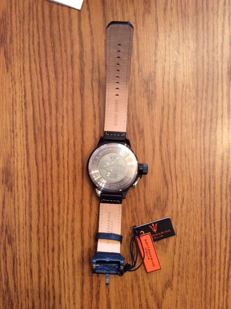 Часы итальянского бренда Sottomarino Italia принадлежащего компании Precision Time Co, новые,полный комплект, 2 коробки, гарантийный буклет,сами часы,ценник со стоимостью часов 279.95$, бирка с названием фирмы, серийный номер SM300279-N. Японский механизм,часы большие,размер циферблата в диаметре 5 см. На колпаке заводной головки часов, эмблема бренда -трезубец. Эта модель часов сделана в стиле другого итальянского часового бренда U-BOOT. Видео обзор этих часов