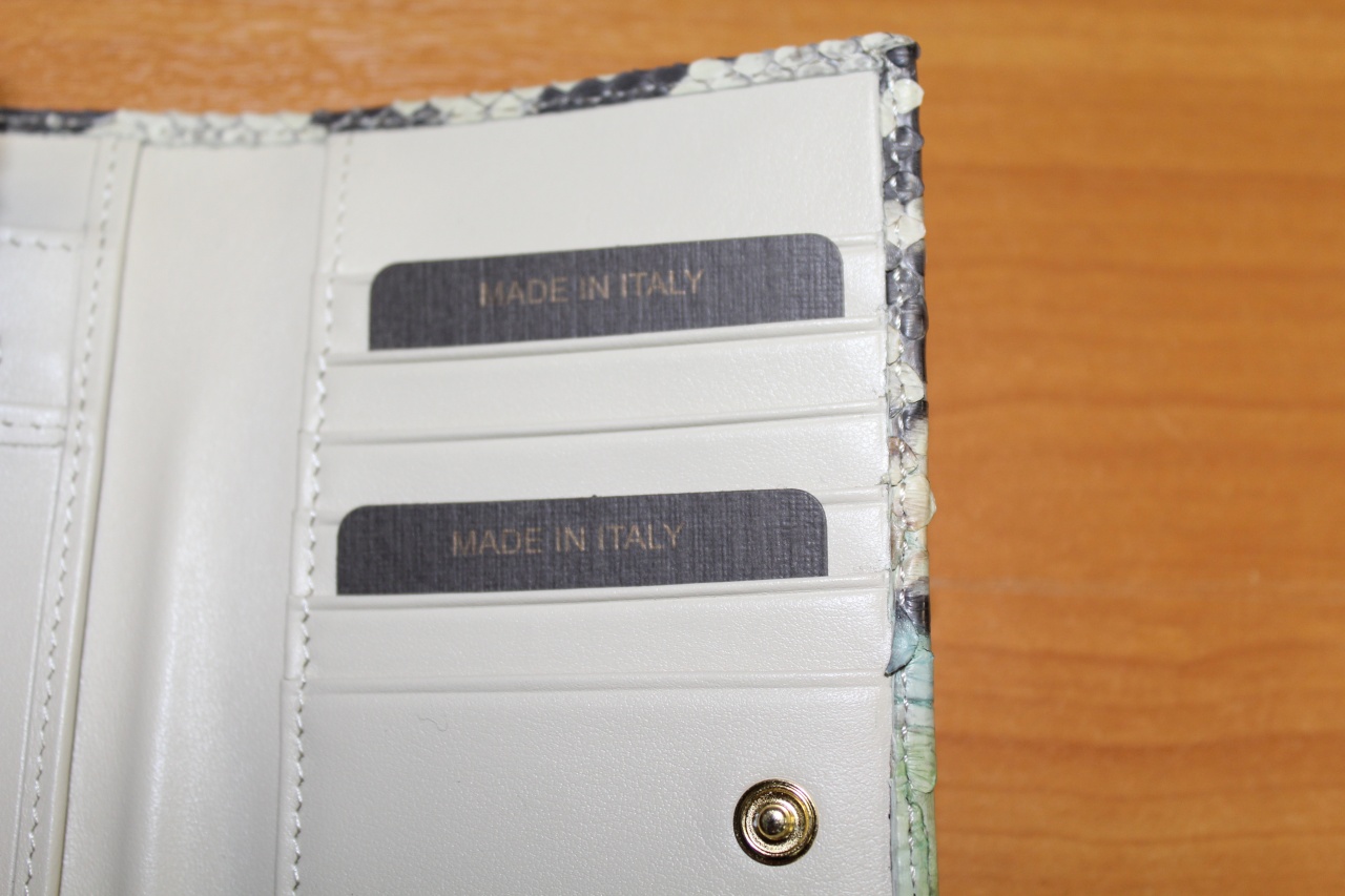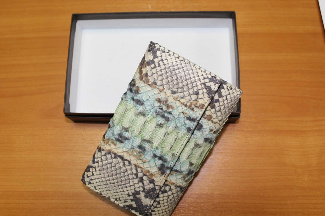 Женский кошелек из 100% кожи анаконды, окрашенный вручную. Произведен в городе Модена (Италия), на фабрике специализирующиеся на изготовлении кожаных изделий и аксессуаров из кожи экзотических животных. Внутри кошелек отделан телячьей кожей светлого цвета и имеет два больших отделения для банкнот, отделение для водительских документов и прав, отделение для мелочи и 9 отделений для хранения кредитных карт или визиток. В комплекте чехол и коробка.