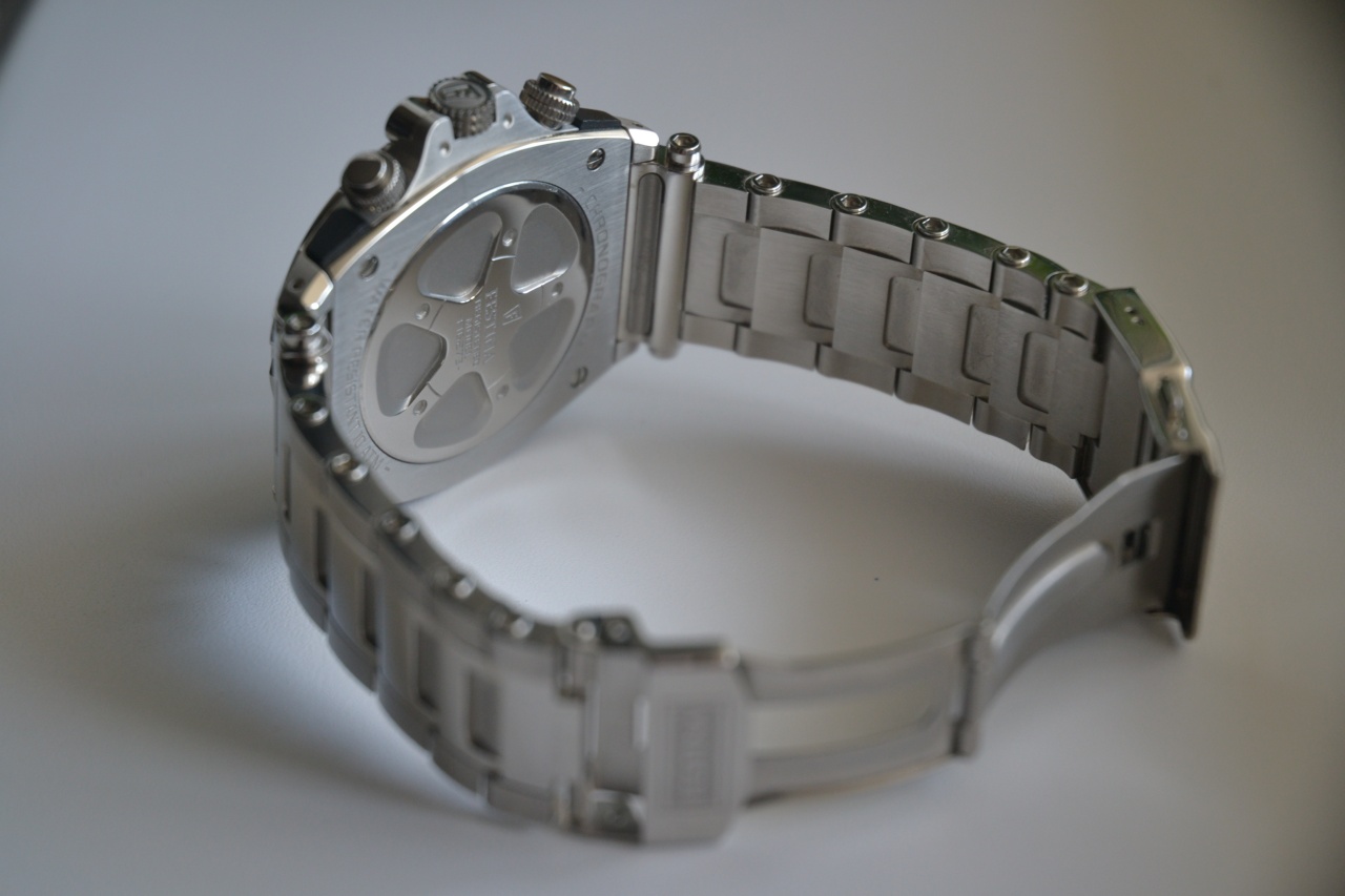 Калибр Miyota M0S90 - хронограф с точностью до 1/100 секунды. Смещенная секундная стрелка (положение 6 часов) в режиме хронографа стрелка отмеряет секунды. Окошко даты с увеличительным стеклом. Центральная стрелка хронографа (1/100). Минутный накопитель в положении 12 часов. Доступные режимы измерения ADD и SPLIT. Максимальное время измерения 59 минут 59 секунд 95 сотых секунды. • 24-часовой индикатор времени суток в положении 9 часов. • Точность хода не хуже -/+ 20 сек./в месяц. • Минеральное стекло устойчивое к возникновению царапин. • Корпус из высококачественного стального сплава 316L с высокими антикоррозийными свойствами. • Водозащита до 10 АТМ. • Литой браслет из нержавеющей стали. • Надежный браслетный замок с тройным сгибом. Диаметр 44 мм.