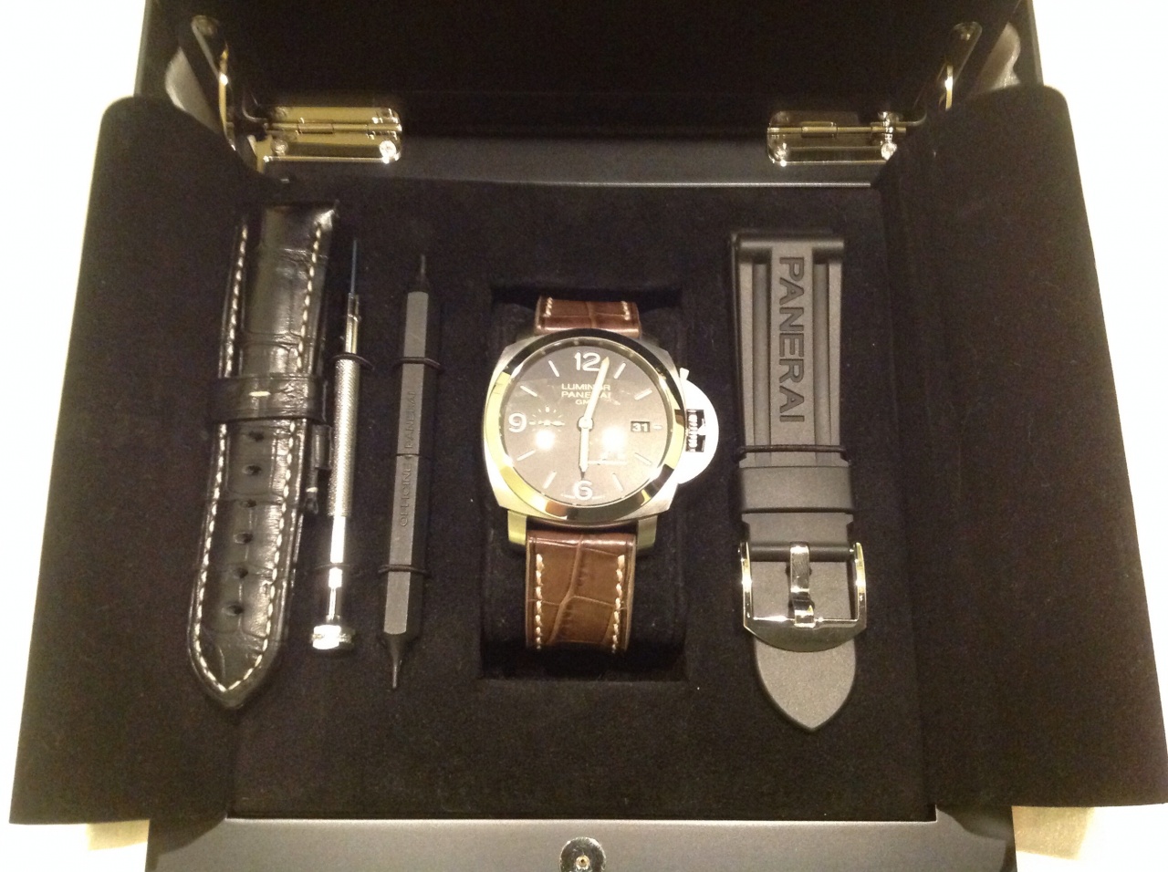 Ремешок Фирменный ремешок PANERAI из крокодиловой кожи с крупной пряжкой из матовой стали. Поставляется со вторым сменным ремешком, инструментом для замены ремешка и стальной отверткой.