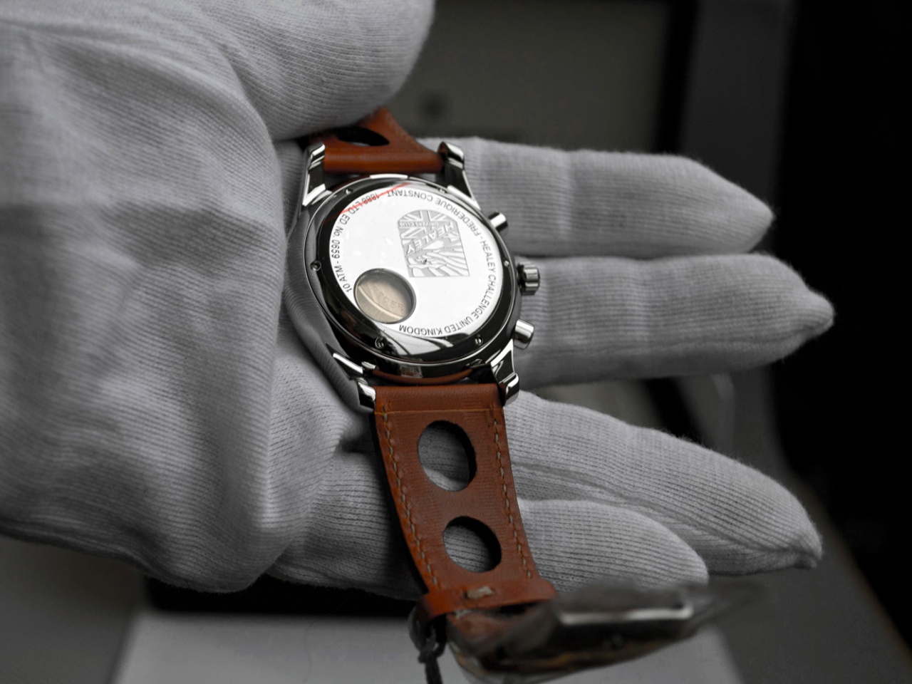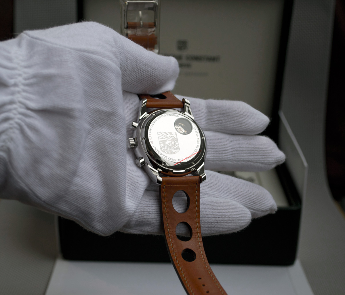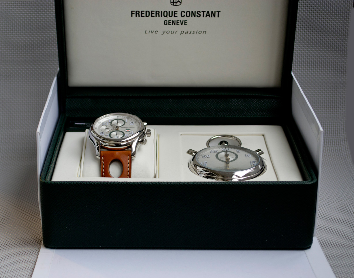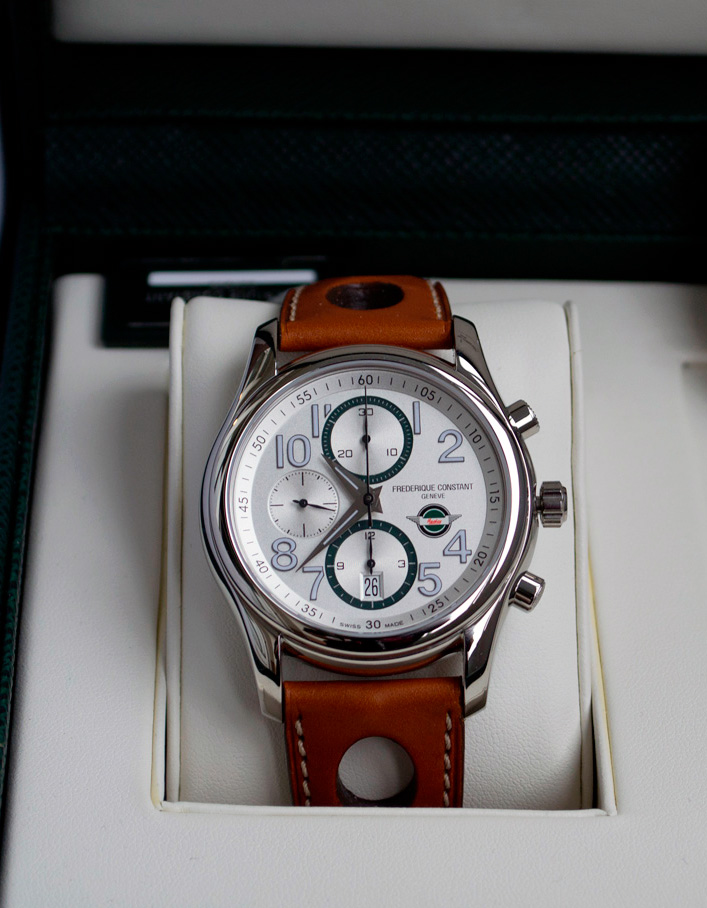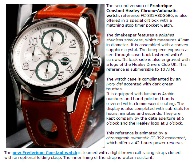 Великолепный швейцарский хронограф Frederique Constant FC-392HSDG6B6, лимитированный выпуск № 6ХХ из 1888 экз. Хронограф создан фирмой Frédérique Constant - официальным Партнером старейшего в мире (с 1957 года) автомобильного клуба владельцев элитных авто Austin Healey в честь автопробега 2010 года в Соединенном Королевстве (Англия), организованном в Девоне и Корнуолле президентом и владельцем клуба Брайан Бик Хили.