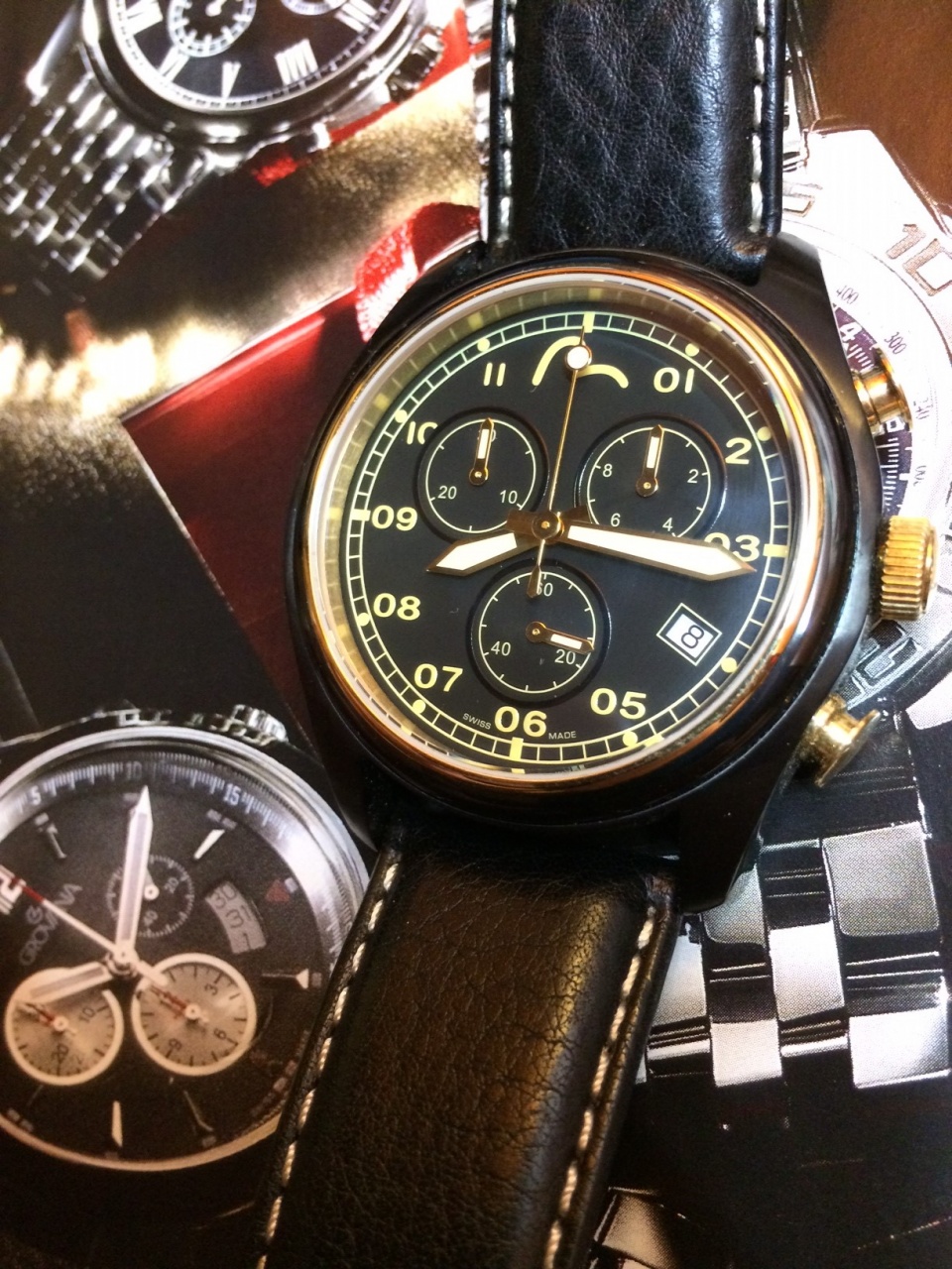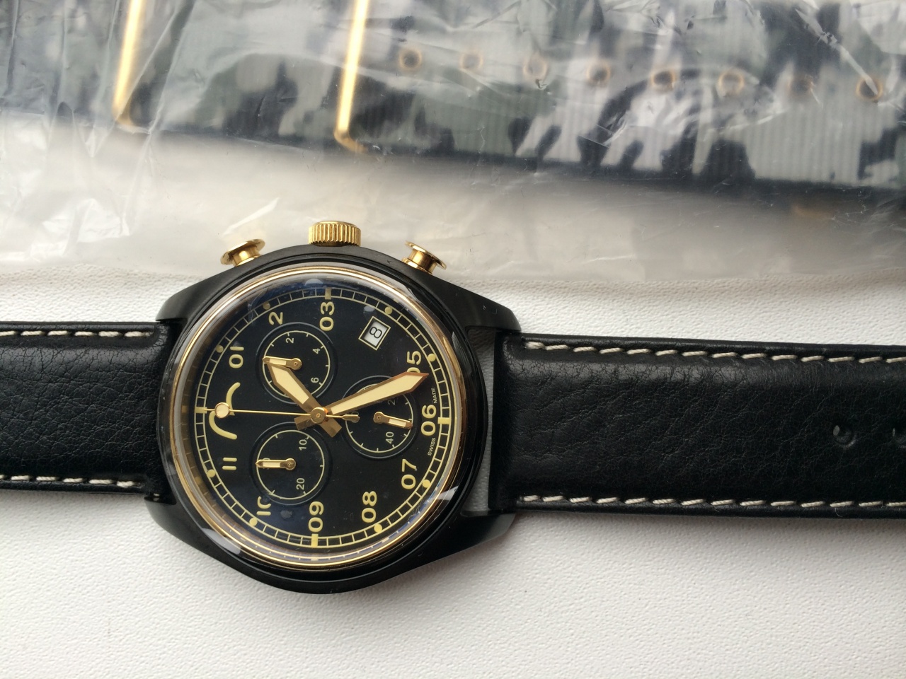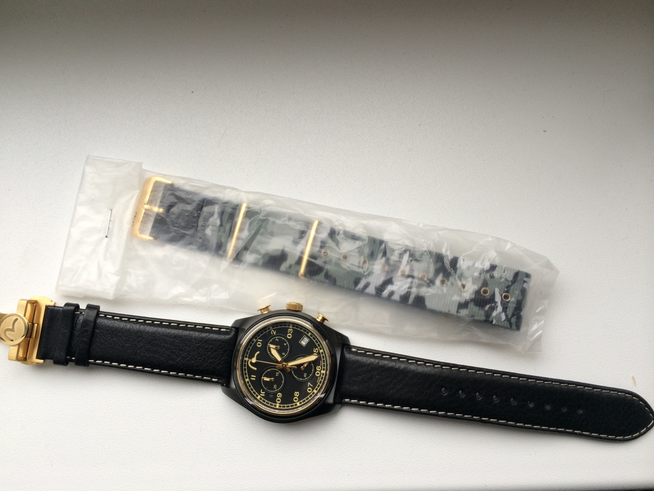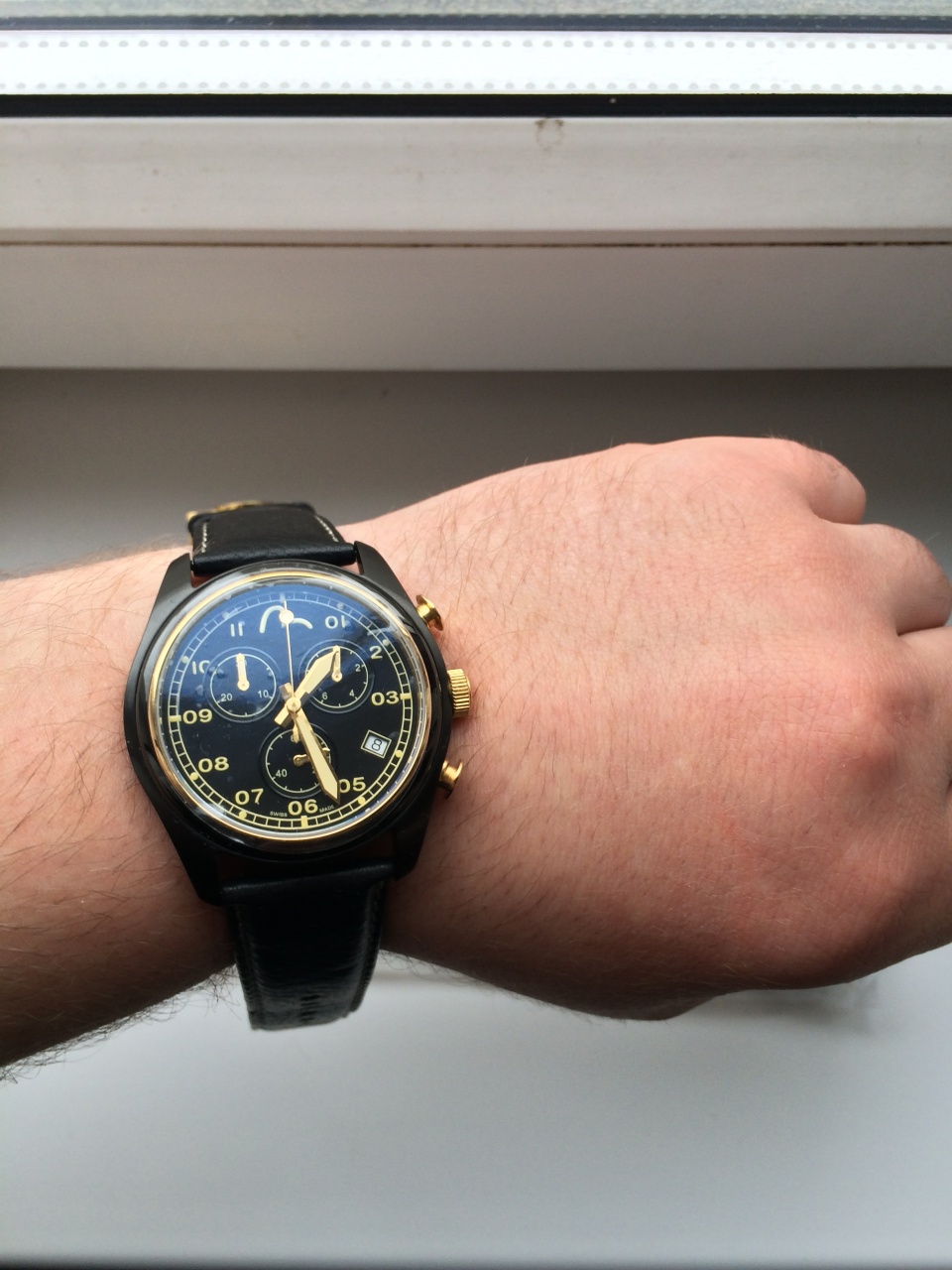 Циферблат черного цвета. "Золотые" стрелки, все с широким люми-полем.