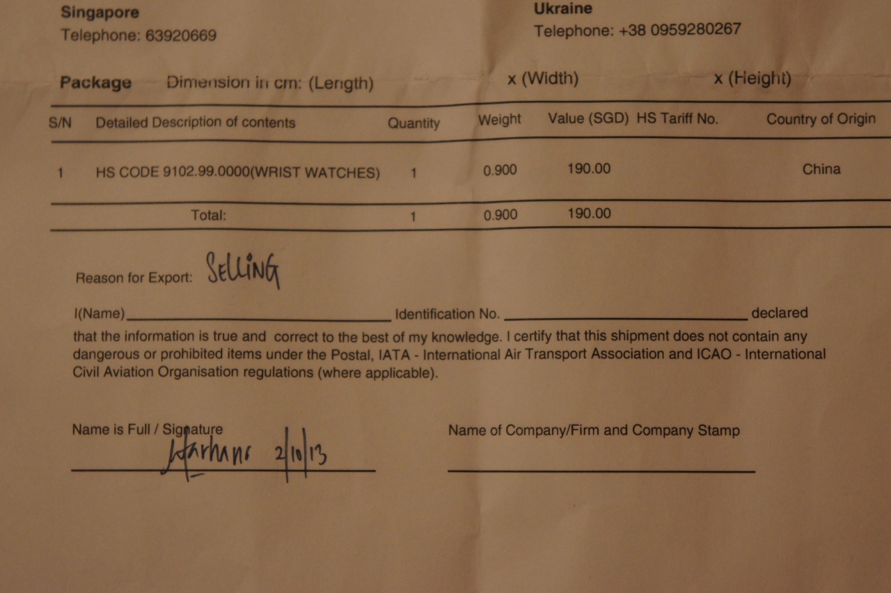 Вот они! Часы наконец-то приехали. Меня ждали 1 принятый и 2 неприятных сюрприза. Начну с приятного. Мне не пришлось платить никаких пошлин, таможня каким-то чудом пропустила мои часы без каких-либо проблем. Далее о нехорошем. Сразу было обнаружено, что коробочка вскрывалась, так как сам пакет был немного неаккуратно разрезан и криво заклеен скотчем, также сама коробка где находились часы была разрезана. Акта об осмотре таможни не было, да и скотч у них особенный. Кто и зачем вскрыл посылку – загадка. Работники ЕМS отказались вскрывать посылку до того как я распишусь. Знаю, что они были не правы, но я не хотел идти на конфликт, плюс все снималось на видео (хорошо что я взял с собой знакомого и фотика). Часы оказались целыми, без повреждений да еще и затикали после небольшого завода. Сюрприз номер 2. В инвойсе Кадер указал следующую инфу – стоимость 190 сингапурских тугриков (не более 200$ получается). Сингапурец, редиска, меня обманул, не застраховал как договаривались. В графе Country of origin вказана China. Пыль в глаза пускал таможенникам, наверно?