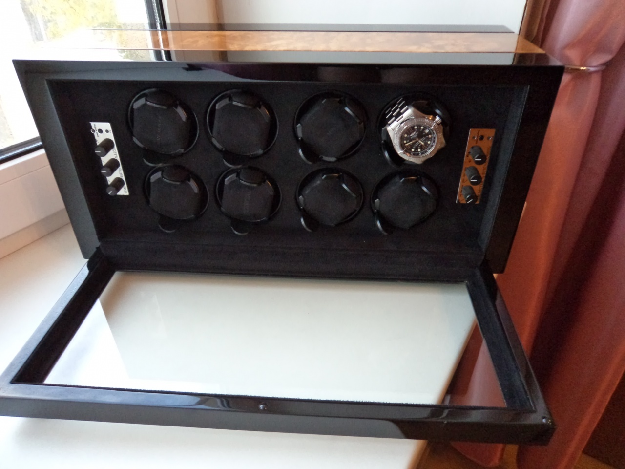 Шкатулка для восьми часов Time Mover Vantage 8, с автоподзаводом. Производство Австрия. Практически новая, имеет два блока управления (на каждые 4 часов - свой блок) использовался один блок в течении одного месяца. Состояние идеальное не считая несколько неглубоких царапок по лаку на задней крышке (на фото видно).