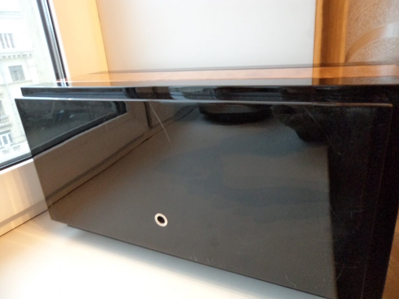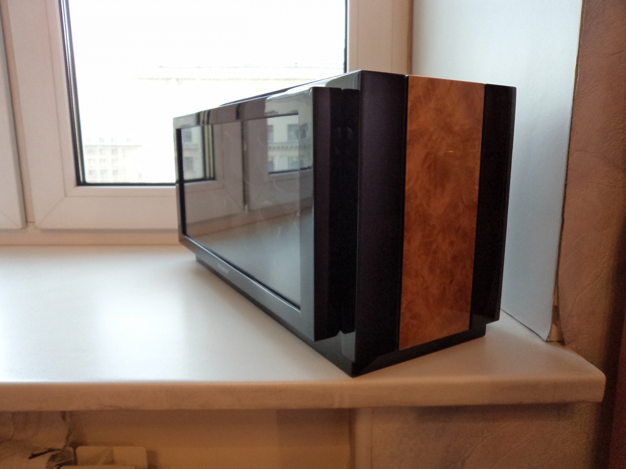 Внешняя отделка массив дерева под черным глянцевым лаком, с вставками из ореха.
