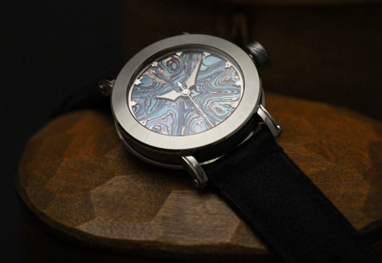 Новинка имеет круглый корпус из нержавеющей и дамасской стали диаметром 42,5 мм и толщиной 9,5 мм, водонепроницаемый до 50 метров, 22-миллиметровым расстоянием между дужками. Заводная головка диаметром 8 мм, установленная в позиции 3 часа, с мелкозернистой отделкой. Плоское сапфировое стекло с антибликовым покрытием защищает циферблат ручной ковки, выполненный из закаленной дамасской стали, льдисто-синеватого оттенка. На периферии циферблата расположено кольцо с часовыми индексами, изготовленное, как и стрелки, из 18-каратного белого золота. Задняя крышка часового корпуса, отделанный циркулярным зернением. Модель оснащена швейцарскими автоматическим механизмом Soprod A10, с функциями индикации часов, минут и секунд (посредством соответствующих центральных стрелок). Калибр дополнительно отделан.