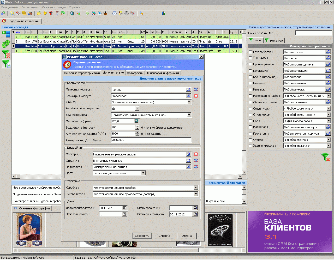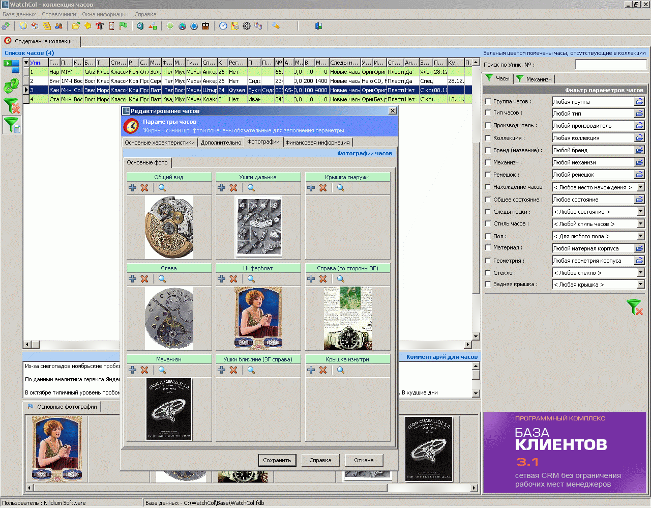 В целом, программа на меня произвела позитивное впечатление, но для моих задач она чересчур наворочена по структуре данных. Такой функционал, как мне кажется, будет востребован в часовых мастерских, магазинах и среди коллекционеров, которые собирают часы и имеют солидное количество экземпляров. Для простых часовых